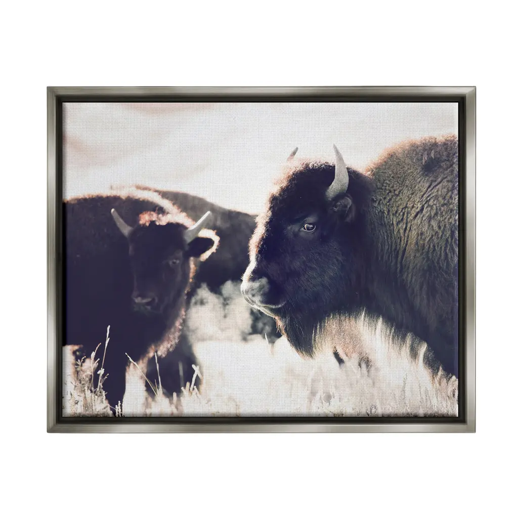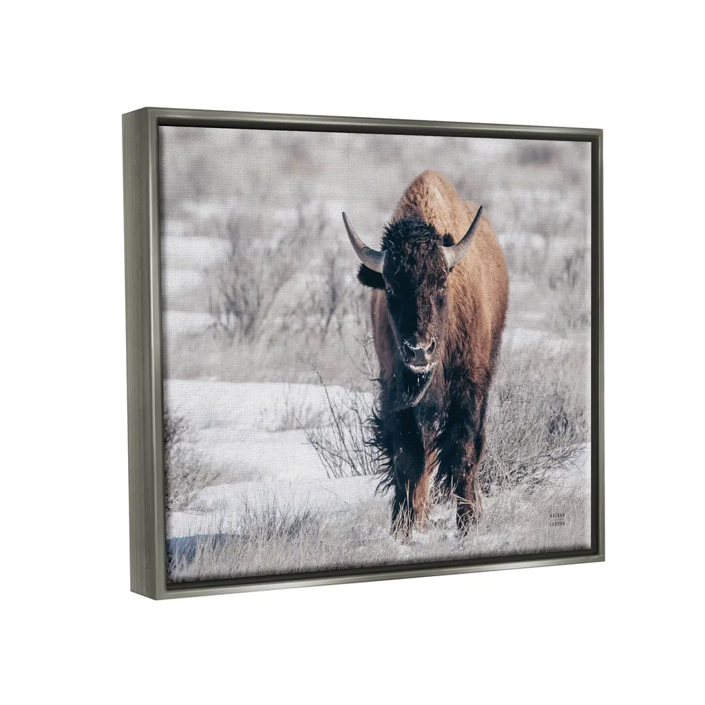 Elevate your home or office to the next level with Stupell Framed Floating Canvas Wall Art. Our premium hand-stretched canvas is mounted securely into a sturdy lightweight frame. The museum-style gap between the wrapped canvas and the box frame gives the illusion of floating artwork. Stupell Wall Art is made in the USA.Features: Dimensions: 21 x 1.7 x 17 Frame, 20 x 1.5 x 16 Canvas ArtFloating Frame Sizes Include Standard: 21 x 1.7 x 17 Oversized: 31 x 1.7 x 25Wall Art is Ready to Hang with Hardware Free Hanging. No installation required. For Easy Set Up Lean or Layer Artwork on Shelf or Against Wall.Our elevated 1.7" Thick Floating Frame is the perfect complement to our canvas style Wall Art. We use only the highest quality inks in house with industry leading printing solutions. Canvas is hand stretched over a durable wood foundation and then mounted securly into a Modern Box Frame. Made in the USA.Artwork Relates To: Animal, Mammal, Buffalo, Wildlife, Bison, Landscape, SnowDesign by Nathan Larson