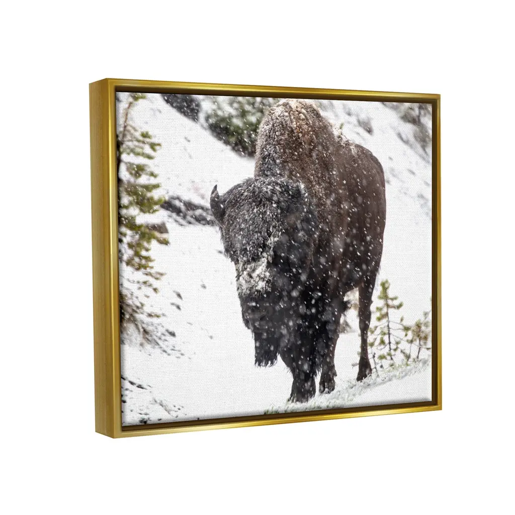 Elevate your home or office to the next level with Stupell Framed Floating Canvas Wall Art. Our premium hand-stretched canvas is mounted securely into a sturdy lightweight frame. The museum-style gap between the wrapped canvas and the box frame gives the illusion of floating artwork. Stupell Wall Art is made in the USA.Features: Dimensions: 21 x 1.7 x 17 Frame, 20 x 1.5 x 16 Canvas ArtFloating Frame Sizes Include Standard: 21 x 1.7 x 17 Oversized: 31 x 1.7 x 25Wall Art is Ready to Hang with Hardware Free Hanging. No installation required. For Easy Set Up Lean or Layer Artwork on Shelf or Against Wall.Our elevated 1.7" Thick Floating Frame is the perfect complement to our canvas style Wall Art. We use only the highest quality inks in house with industry leading printing solutions. Canvas is hand stretched over a durable wood foundation and then mounted securly into a Modern Box Frame. Made in the USA.Artwork Relates To: Animal, Bison, Mammal, Wildlife, Winter, Snow, LandscapeDesign by Kathy Mansfield