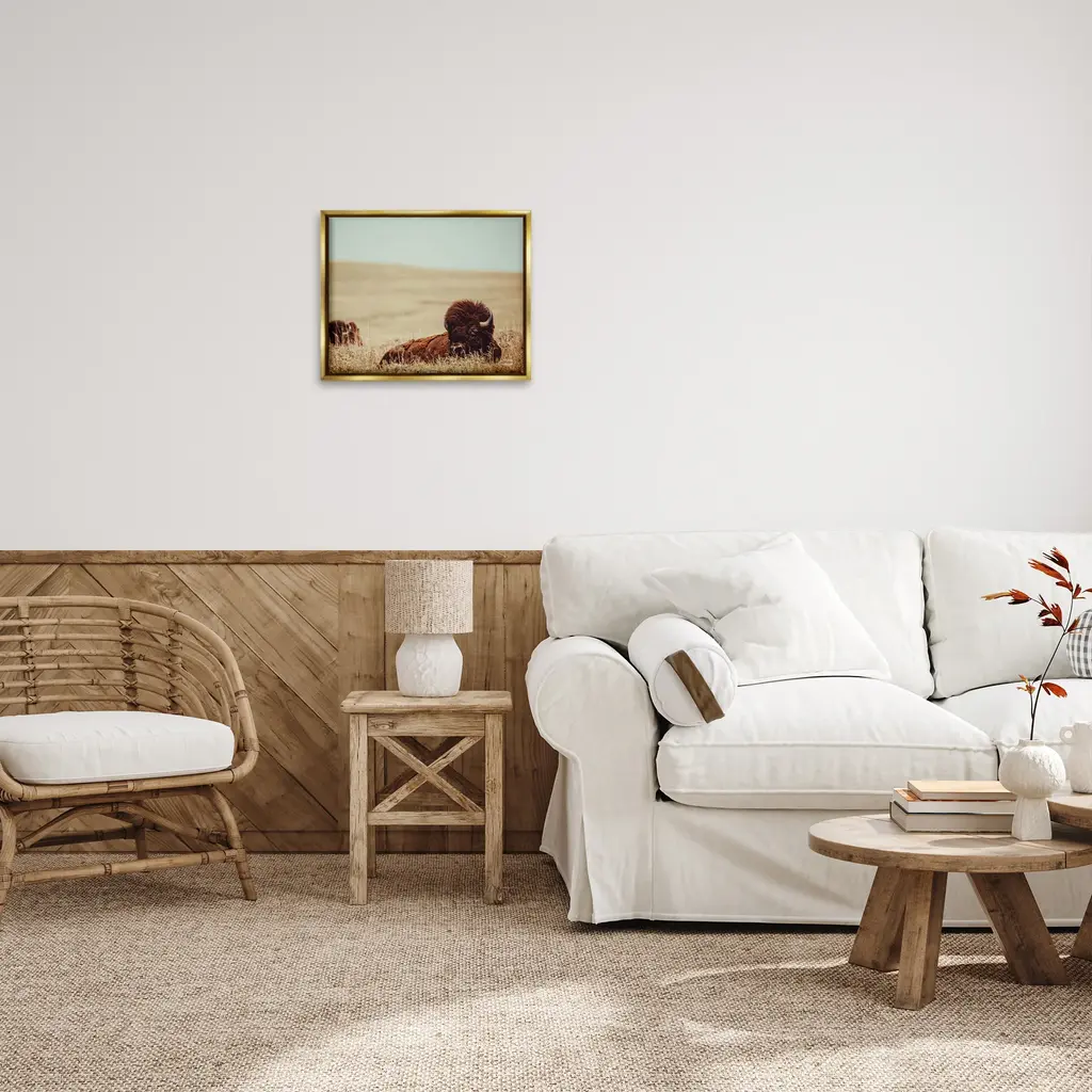 Elevate your home or office to the next level with Stupell Framed Floating Canvas Wall Art. Our premium hand-stretched canvas is mounted securely into a sturdy lightweight frame. The museum-style gap between the wrapped canvas and the box frame gives the illusion of floating artwork. Stupell Wall Art is made in the USA.Features: Dimensions: 21 x 1.7 x 17 Frame, 20 x 1.5 x 16 Canvas ArtFloating Frame Canvas Products are available in sizes 21"x17" and 31"x25". All Floating Frame Canvas Products have a 1.7" Depth.Wall Art is Ready to Hang with Hardware Free Hanging. No Installation required. For Easy Set Up Lean or Layer Artwork on Shelf or Against Wall. Artwork is Permently Fixed into the Frame.Our elevated 1.7" Thick Floating Frame is the perfect complement to our canvas style Wall Art. We use only the highest quality inks in house with industry leading printing solutions. Canvas is hand stretched over a durable wood foundation and then mounted securly into a Modern Box Frame. Made in the USA.Artwork Relates To: Animal, Buffalo, Mammal, Wildlife, Bison, Field, Grassland, Nature, Country, Farm, LandscapeDesign by Nathan Larson
