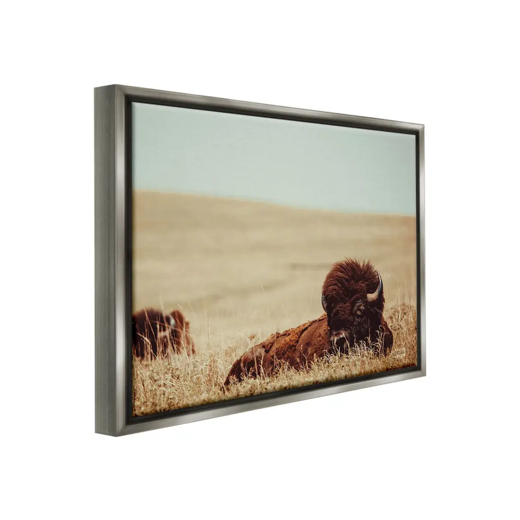 Elevate your home or office to the next level with Stupell Framed Floating Canvas Wall Art. Our premium hand-stretched canvas is mounted securely into a sturdy lightweight frame. The museum-style gap between the wrapped canvas and the box frame gives the illusion of floating artwork. Stupell Wall Art is made in the USA.Features: Dimensions: 21 x 1.7 x 17 Frame, 20 x 1.5 x 16 Canvas ArtFloating Frame Canvas Products are available in sizes 21"x17" and 31"x25". All Floating Frame Canvas Products have a 1.7" Depth.Wall Art is Ready to Hang with Hardware Free Hanging. No Installation required. For Easy Set Up Lean or Layer Artwork on Shelf or Against Wall. Artwork is Permently Fixed into the Frame.Our elevated 1.7" Thick Floating Frame is the perfect complement to our canvas style Wall Art. We use only the highest quality inks in house with industry leading printing solutions. Canvas is hand stretched over a durable wood foundation and then mounted securly into a Modern Box Frame. Made in the USA.Artwork Relates To: Animal, Buffalo, Mammal, Wildlife, Bison, Field, Grassland, Nature, Country, Farm, LandscapeDesign by Nathan Larson