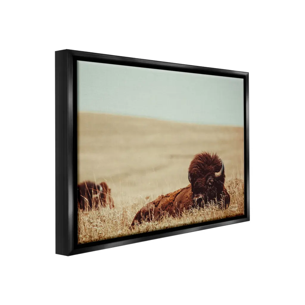 Elevate your home or office to the next level with Stupell Framed Floating Canvas Wall Art. Our premium hand-stretched canvas is mounted securely into a sturdy lightweight frame. The museum-style gap between the wrapped canvas and the box frame gives the illusion of floating artwork. Stupell Wall Art is made in the USA.Features: Dimensions: 21 x 1.7 x 17 Frame, 20 x 1.5 x 16 Canvas ArtFloating Frame Canvas Products are available in sizes 21"x17" and 31"x25". All Floating Frame Canvas Products have a 1.7" Depth.Wall Art is Ready to Hang with Hardware Free Hanging. No Installation required. For Easy Set Up Lean or Layer Artwork on Shelf or Against Wall. Artwork is Permently Fixed into the Frame.Our elevated 1.7" Thick Floating Frame is the perfect complement to our canvas style Wall Art. We use only the highest quality inks in house with industry leading printing solutions. Canvas is hand stretched over a durable wood foundation and then mounted securly into a Modern Box Frame. Made in the USA.Artwork Relates To: Animal, Buffalo, Mammal, Wildlife, Bison, Field, Grassland, Nature, Country, Farm, LandscapeDesign by Nathan Larson