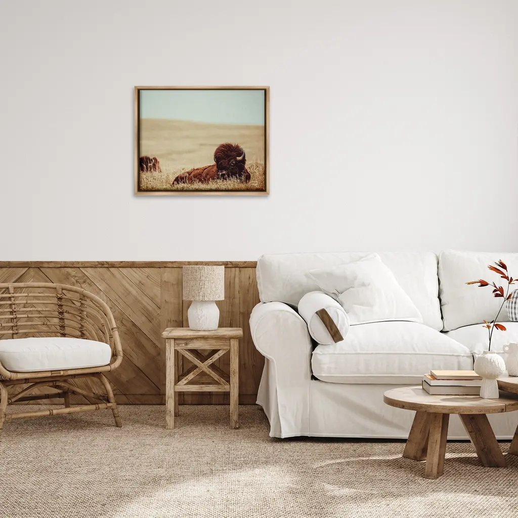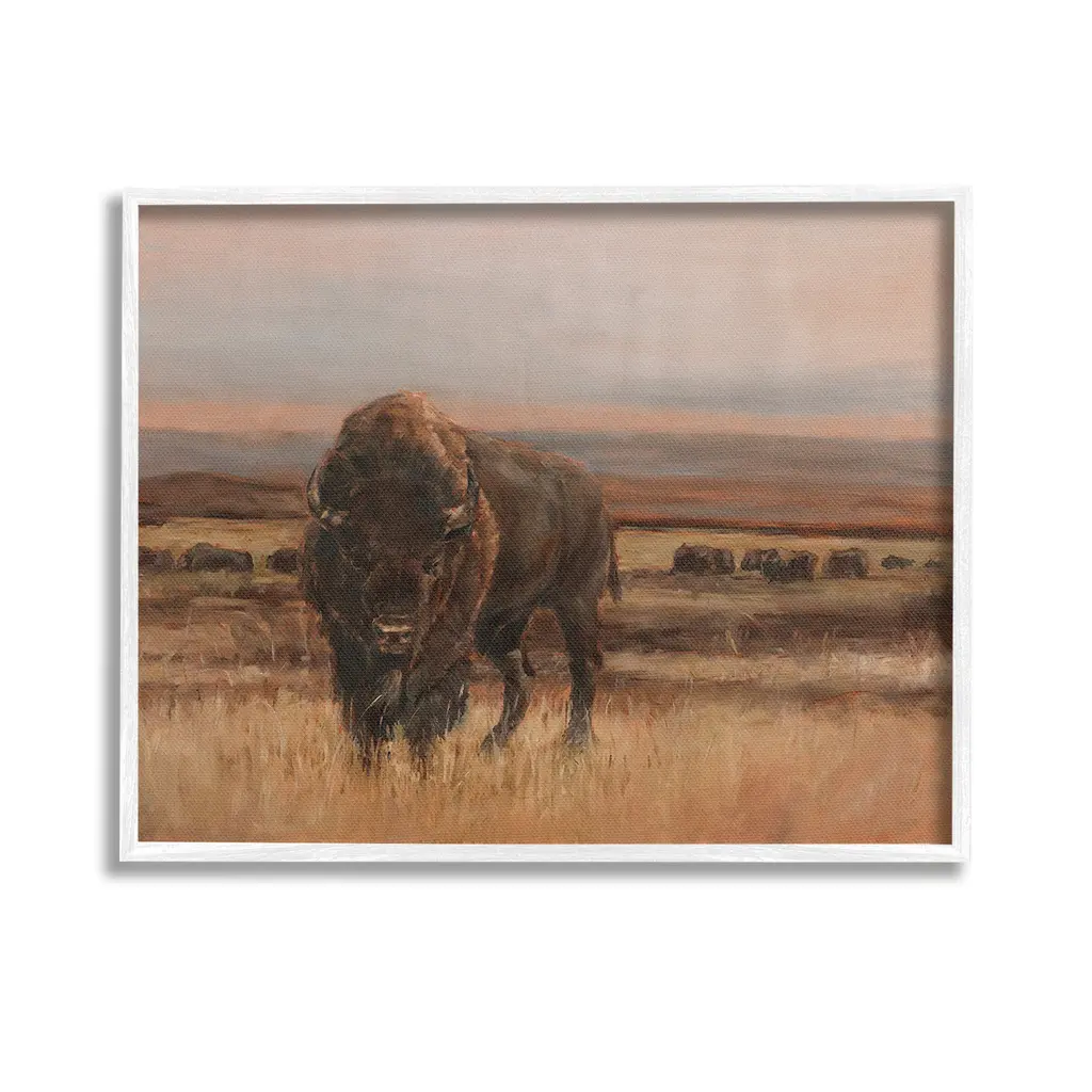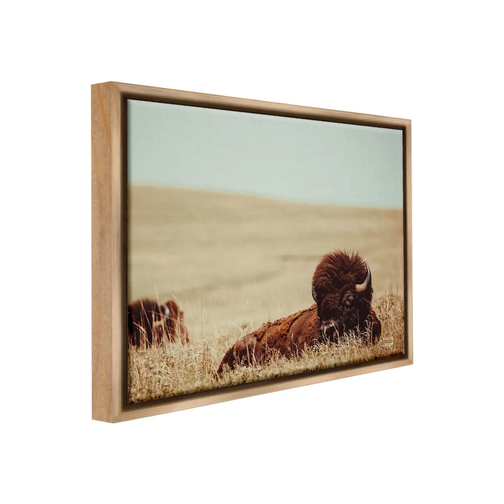 Elevate your home or office to the next level with Stupell Framed Floating Canvas Wall Art. Our premium hand-stretched canvas is mounted securely into a sturdy lightweight frame. The museum-style gap between the wrapped canvas and the box frame gives the illusion of floating artwork. Stupell Wall Art is made in the USA.Features: Dimensions: 21 x 1.7 x 17 Frame, 20 x 1.5 x 16 Canvas ArtFloating Frame Canvas Products are available in sizes 21"x17" and 31"x25". All Floating Frame Canvas Products have a 1.7" Depth.Wall Art is Ready to Hang with Hardware Free Hanging. No Installation required. For Easy Set Up Lean or Layer Artwork on Shelf or Against Wall. Artwork is Permently Fixed into the Frame.Our elevated 1.7" Thick Floating Frame is the perfect complement to our canvas style Wall Art. We use only the highest quality inks in house with industry leading printing solutions. Canvas is hand stretched over a durable wood foundation and then mounted securly into a Modern Box Frame. Made in the USA.Artwork Relates To: Animal, Buffalo, Mammal, Wildlife, Bison, Field, Grassland, Nature, Country, Farm, LandscapeDesign by Nathan Larson