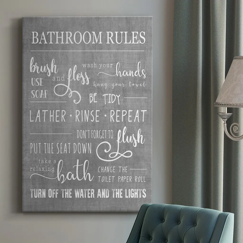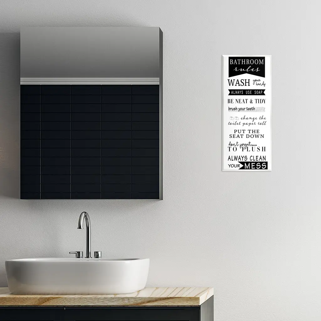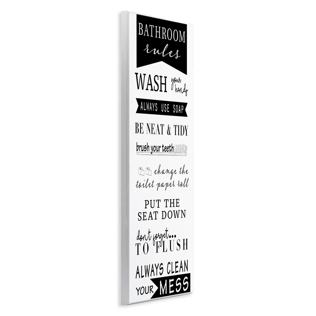 Our wall plaques start as high-quality lithograph prints mounted on durable 0.5-inch thick MDF wood. Each piece is hand finished and comes with a fresh layer of white foil on the sides to give it a crisp, clean look. Plaques arrive ready to hang without installation and come with removable plastic corners to keep them from damage in transit. Stupell Wall Art is made in the USA.Features: Dimensions: 7 x 0.5 x 17 InchesWall Art is Ready to Hang with Hardware Free Hanging. No installation required. For Easy Set Up Lean or Layer Artwork on Shelf or Against Wall.All of our wall plaques start off as high quality lithograph prints that are then mounted on durable 0.5 inch thick MDF wood. Each piece is hand finished and comes with a fresh layer of foil on the sides to give it a crisp clean look. Made In USA.Artwork Relates To: Bathroom, Rules, Hygiene, Minimal, SimpleDesign by Anna Quach