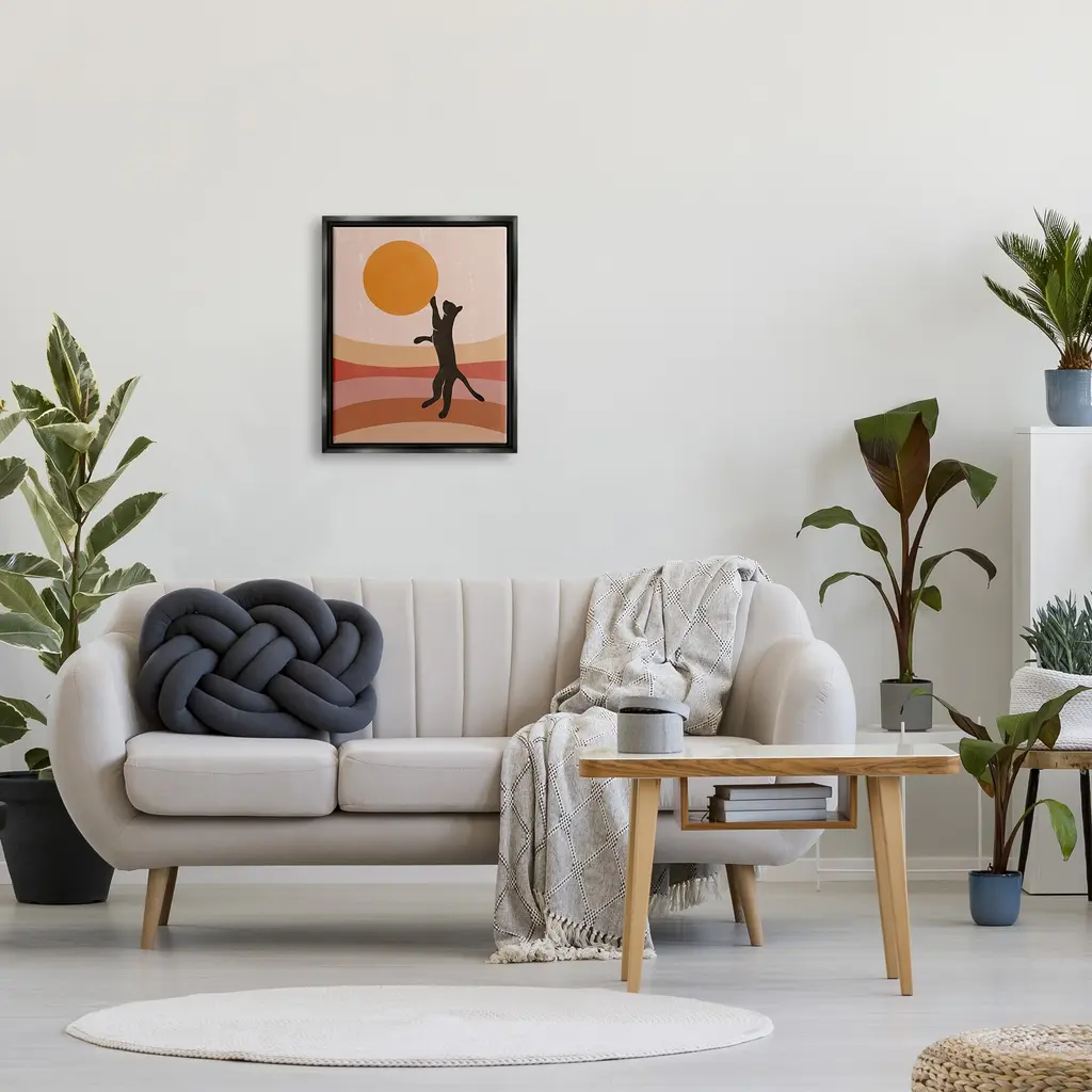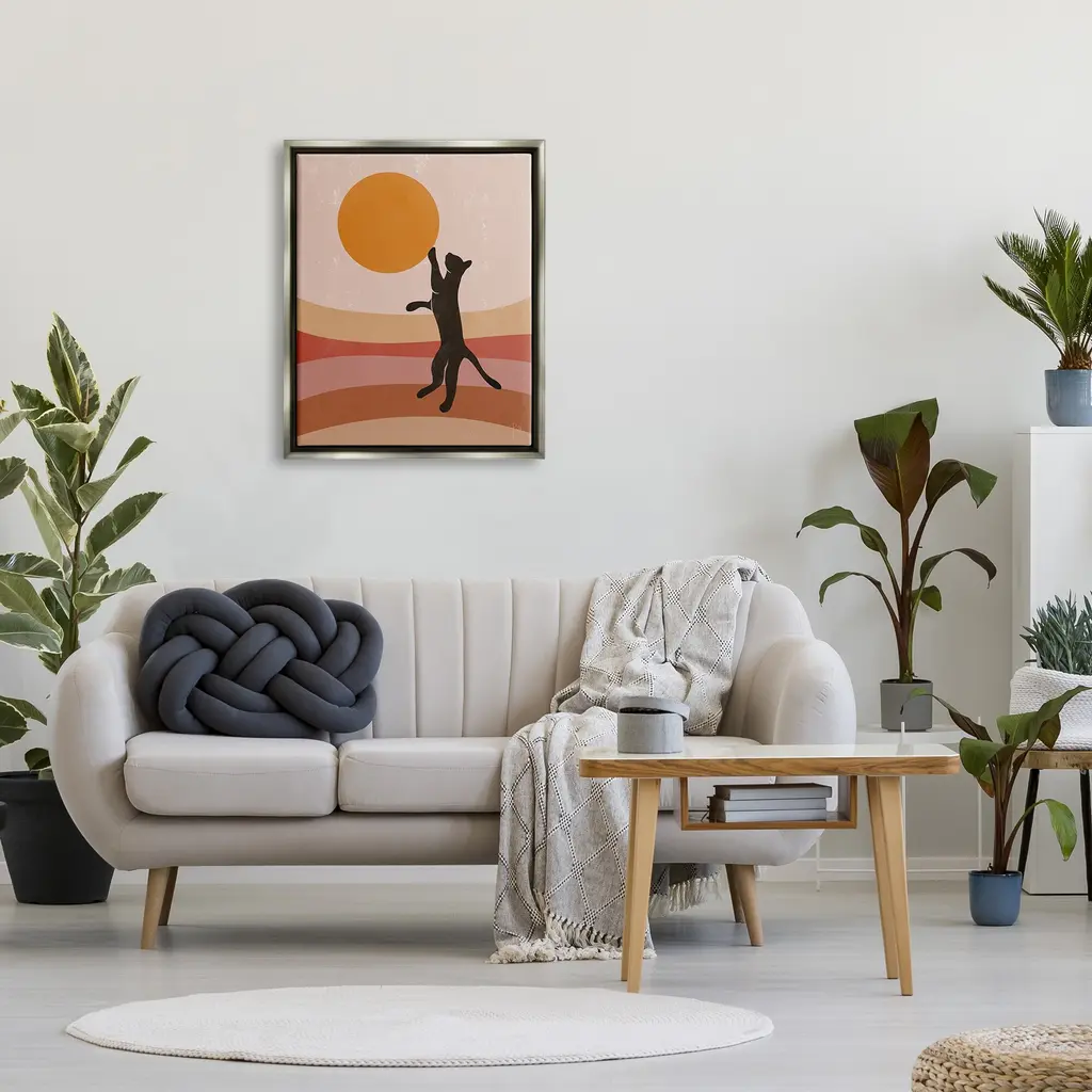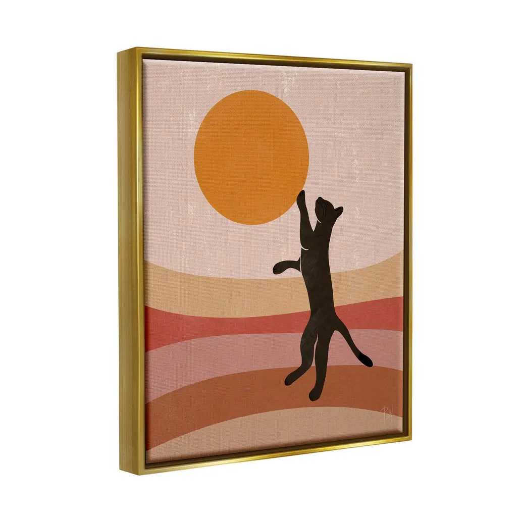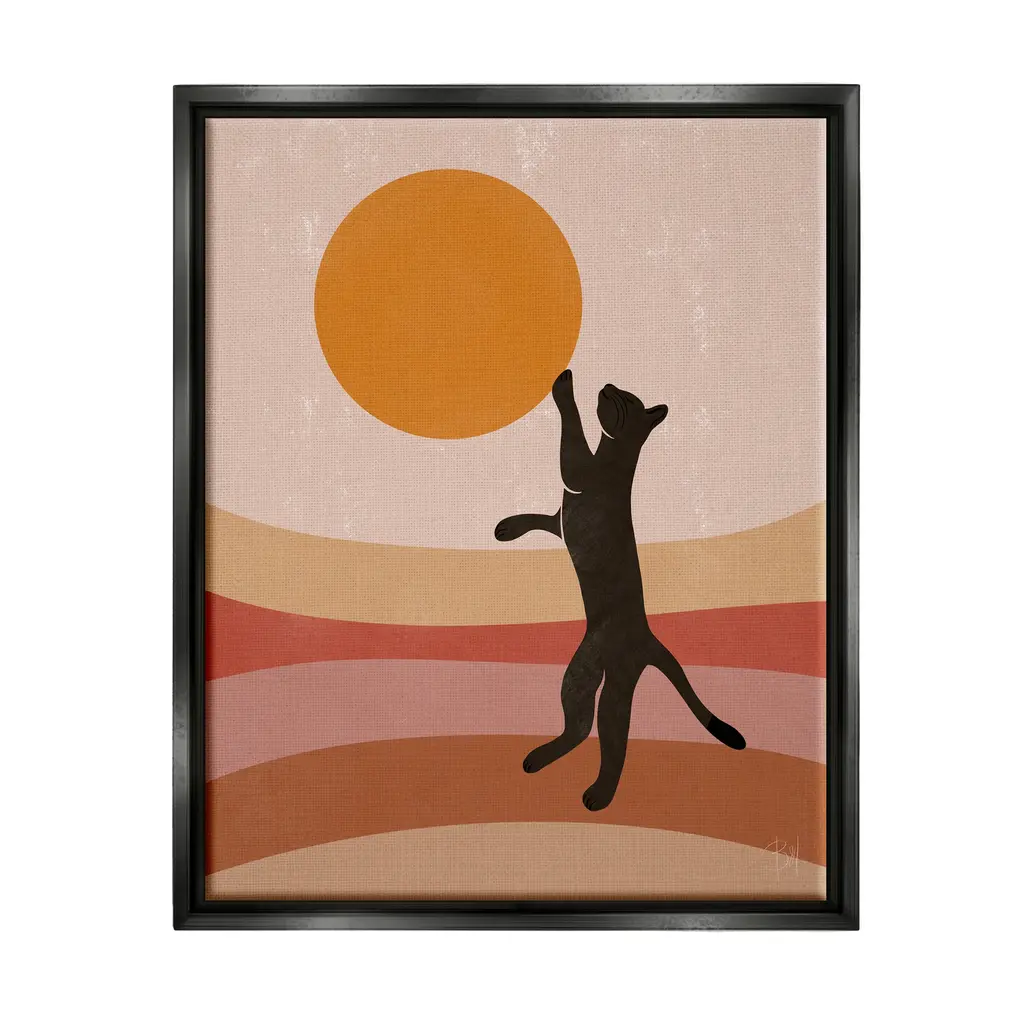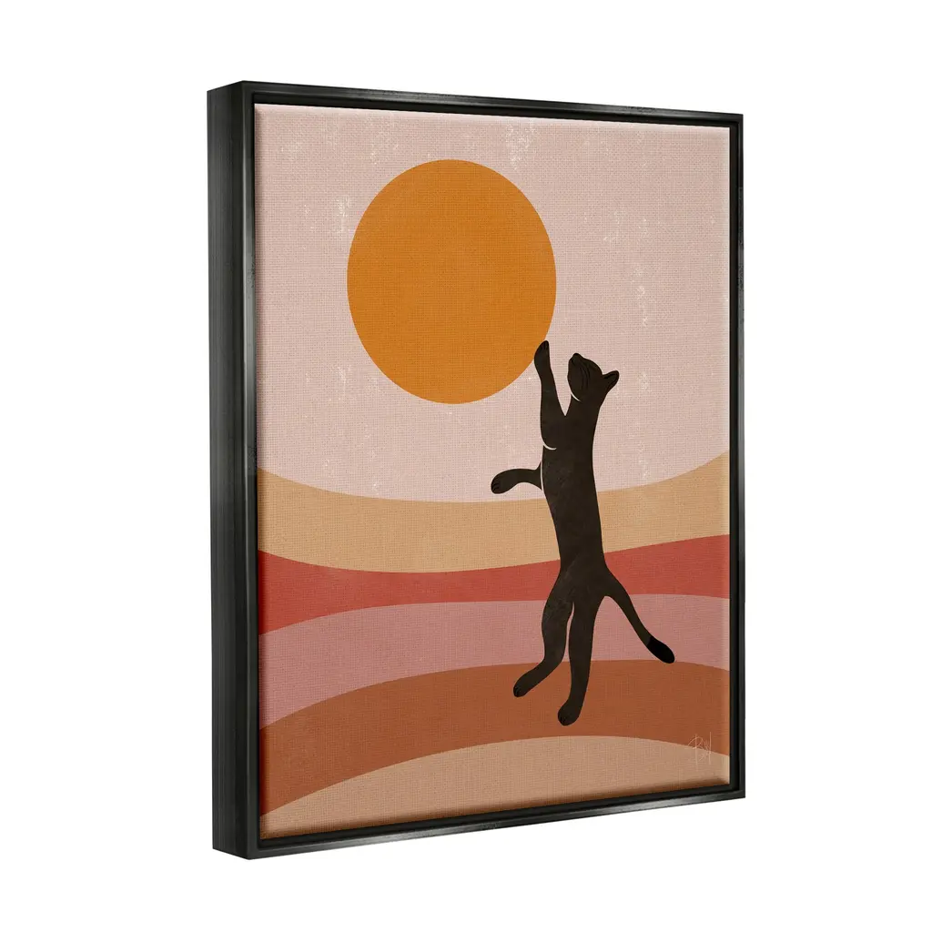 Elevate your home or office to the next level with Stupell Framed Floating Canvas Wall Art. Our premium hand-stretched canvas is mounted securely into a sturdy lightweight frame. The museum-style gap between the wrapped canvas and the box frame gives the illusion of floating artwork. Stupell Wall Art is made in the USA.Features: Dimensions: 17 x 1.7 x 21 Frame, 16 x 1.5 x 20 Canvas ArtFloating Frame Sizes Include Standard: 17 x 1.7 x 21 Oversized: 25 x 1.7 x 31Wall Art is Ready to Hang - No Installation or Hardware Needed. For Easy Set Up Lean or Layer Artwork on Shelf or Against Wall.Our elevated 1.7" Thick Floating Frame is the perfect complement to our canvas style Wall Art. We use only the highest quality inks in house with industry leading printing solutions. Canvas is hand stretched over a durable wood foundation and then mounted securly into a Modern Box Frame. Made in the USA.Artwork Relates To: Animal, Cat, Mammal, Pet, Silhouette, Modern, Stripes, Nature, Pattern, SunDesign by Birch&Ink