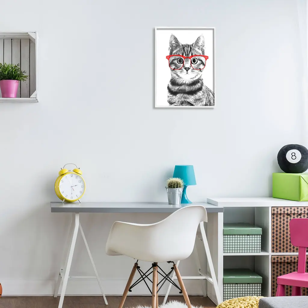 Stupell Black White Monochrome Cat Red Glasses Design Framed Wall Art - 16 X 20 - White