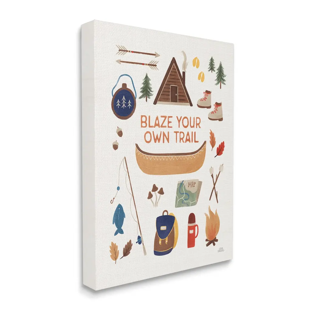 We create our stretched canvas to the highest standards. Using only the highest quality inks and canvas on Mimaki printers, we hand-cut and stretch each piece over a 1.5-inch thick wooden frame for hanging. As a result, the art comes ready to hang on the sturdy ledge with no installation required. Stupell Wall Art is made in the USA.Features: Dimensions: 16 x 1.5 x 20 InchesStretched Canvas Sizes Include Standard: 16 x 1.5 x 20 Large: 20 x 1.5 x 30 X-Large: 30 x 1.5 x 40 Oversized: 36 x 1.5 x 48Wall Art is Ready to Hang with Hardware Free Hanging. No installation required. For Easy Set Up Lean or Layer Artwork on Shelf or Against Wall.Our stretched canvas is created with the highest standards. We use only the highest quality inks and canvas on our in house Mimaki printers, and then hand cut and stretch each piece over a 1.5 inch thick wooden frame for hanging. Made In USA.Artwork Relates To: Boat, Canoe, Camping, Nature, Landscape, Woodland, Adventure, Tent, Cocoa, Compass, Tree, Lantern, Blaze Your Own TrailDesign by Laura Marshall