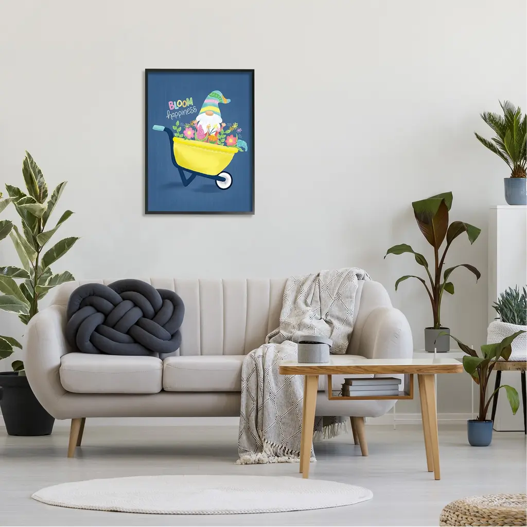 Stupell Bloom Happiness Phrase Yellow Flower Wagon Gnome Framed Wall Art - Blue - 24 X 30 - Black