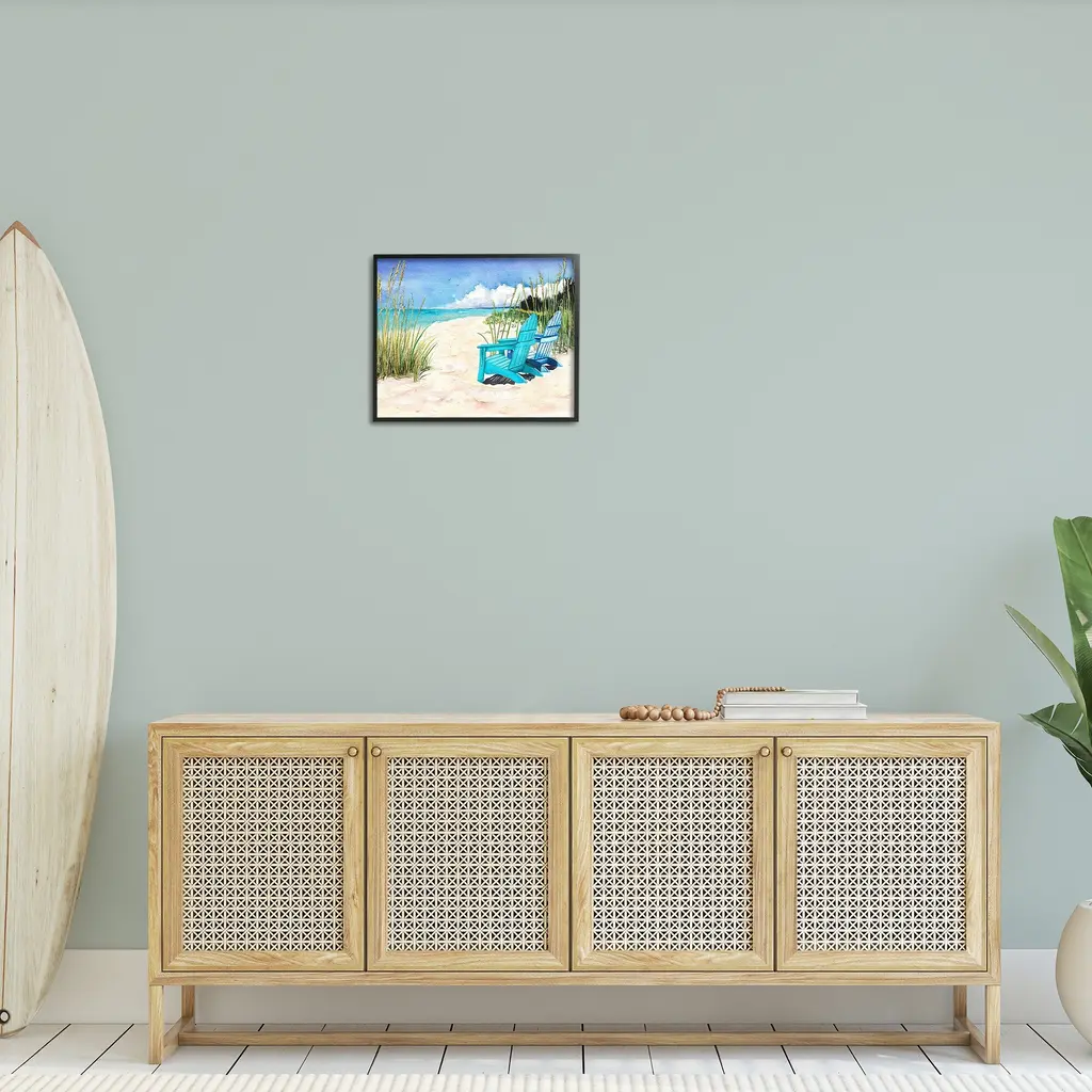 Add dimension to any room with our textured Framed Giclee Artwork. Our framed artwork is securely mounted into a 1.5-inch thick wood grain frame and ready to hang. Frames are available in three alluring styles: black, gray farmhouse and white. In addition, you should check out our oversized options if you want a statement piece. Stupell Wall Art is made in the USA.Features: Dimensions: 14 x 1.5 x 11 FramedFramed Giclee Products are available in the sizes 14"x11", 20"x16" or 30"x24". All Framed Giclee Products have a 1.5" Depth. Wall Art is Ready to Hang with Hardware Free Hanging. No installation required. For Easy Set Up Lean or Layer Artwork on Shelf or Against Wall.Our giclée prints are carefully mounted on a durable MDF backing, and then perfectly finished in a 1.5 inch thick woodgrain frame. Mounted frame colors include black, gray farmhouse and white. Made In USA.Artwork Relates To: Sky, Horizon, Sea, Water, Beach, Coast, Shoreline, Scenery, Sea Waves, Summer, Beach ChairDesign by Christine Reichow