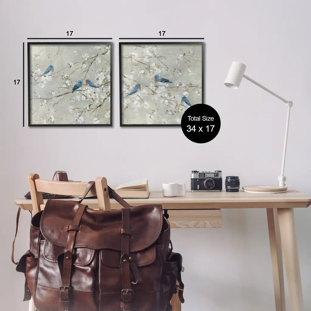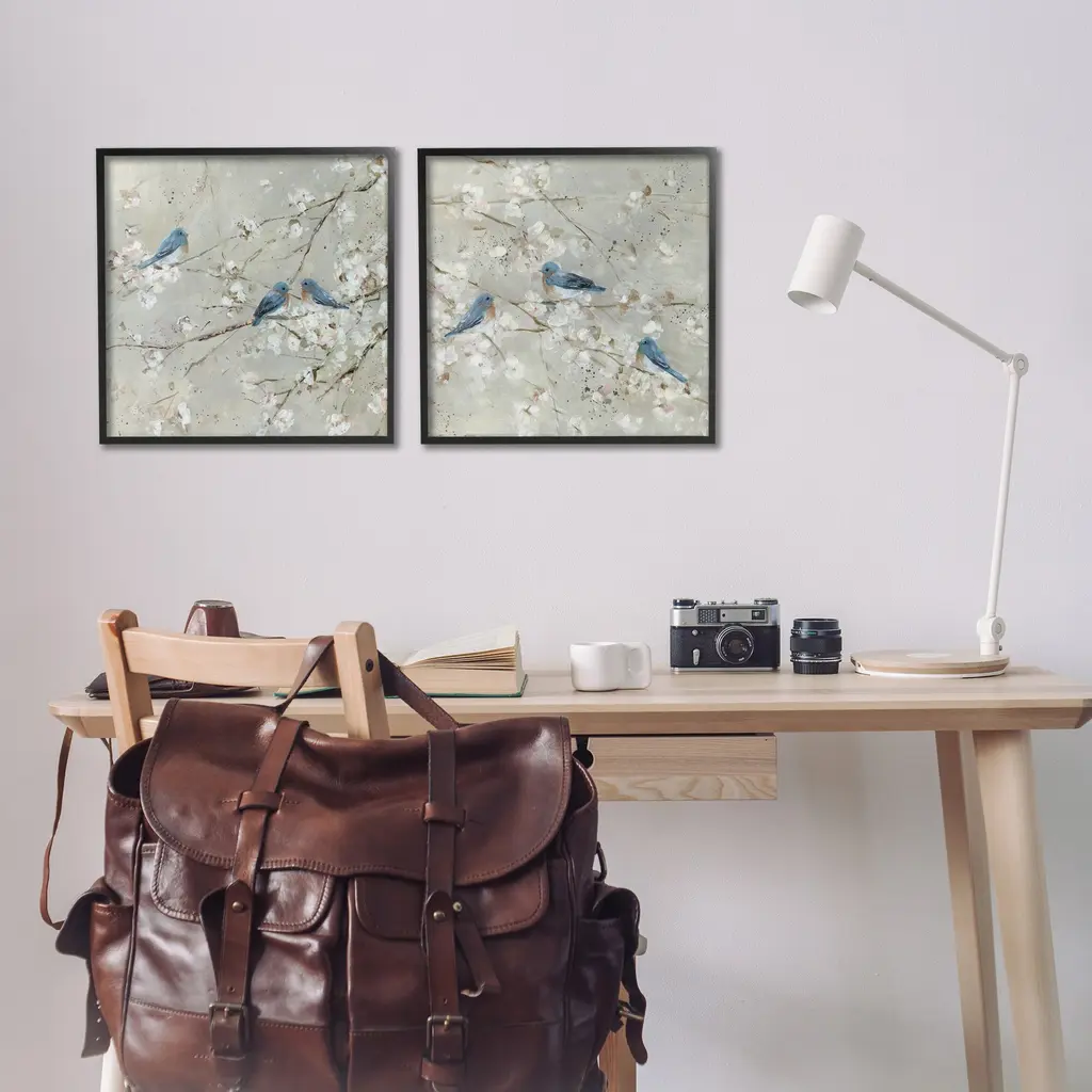 Stupell Blue Birds Perched Tree Blossoms Spring Scene 2Pc Multi Piece Framed Wall Art Set - Brown - 17 X 17 - Black