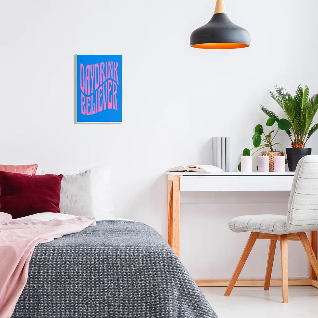 Our wall plaques start as high-quality lithograph prints mounted on durable 0.5-inch thick MDF wood. Each piece is hand finished and comes with a fresh layer of white foil on the sides to give it a crisp, clean look. Plaques arrive ready to hang without installation and come with removable plastic corners to keep them from damage in transit. Wall Art is made in the USA.Features: Dimensions: 10 x 0.5 x 15 InchesWall Plaque Sizes Include Standard: 10 x 0.5 x 15 Oversized: 13 x 0.5 x 19Wall Art is Ready to Hang with Hardware Free Hanging. No installation required. For Easy Set Up Lean or Layer Artwork on Shelf or Against Wall.All of our wall plaques start off as high quality lithograph prints that are then mounted on durable 0.5 inch thick MDF wood. Each piece is hand finished and comes with a fresh layer of foil on the sides to give it a crisp clean look. Made In USA.Artwork Relates To: Phrase, Bold, Vivid, Daydrink BelieverDesign by House of Lulu