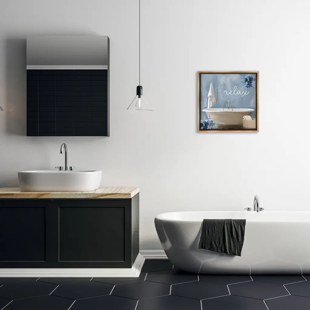 Elevate your home or office to the next level with Stupell Framed Floating Canvas Wall Art. Our premium hand-stretched canvas is mounted securely into a sturdy lightweight frame. The museum-style gap between the wrapped canvas and the box frame gives the illusion of floating artwork. Stupell Wall Art is made in the USA.Features: Dimensions: 18 x 1.7 x 18 Frame, 17 x 1.5 x 17 Canvas ArtFloating Frame Canvas Products are available in sizes 18"x18" and 25"x25". All Floating Frame Canvas Products have a 1.7" Depth.Wall Art is Ready to Hang with Hardware Free Hanging. No Installation required. For Easy Set Up Lean or Layer Artwork on Shelf or Against Wall. Artwork is Permently Fixed into the Frame.Our elevated 1.7" Thick Floating Frame is the perfect complement to our canvas style Wall Art. We use only the highest quality inks in house with industry leading printing solutions. Canvas is hand stretched over a durable wood foundation and then mounted securly into a Modern Box Frame. Made in the USA.Artwork Relates To: Bathtub, Tub, Flower, Blossom, Plant, Indoors, RelaxDesign by Kim Allen