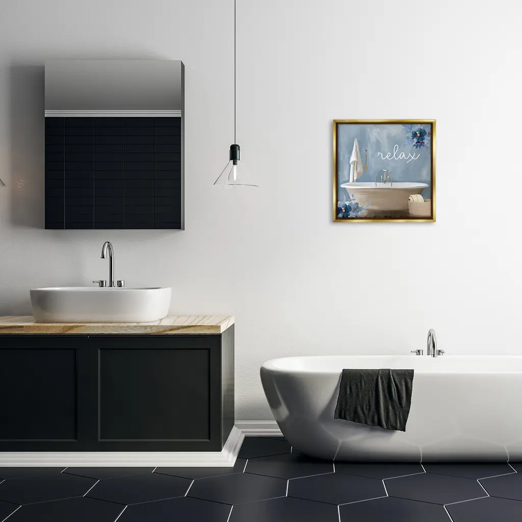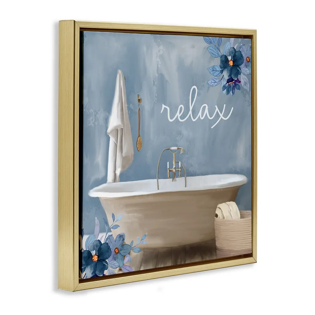 Stupell Blue Floral Relax Bathroom Scene Framed Floater Canvas Wall Art Design By Kim Allen - 18 X 18 - Gold