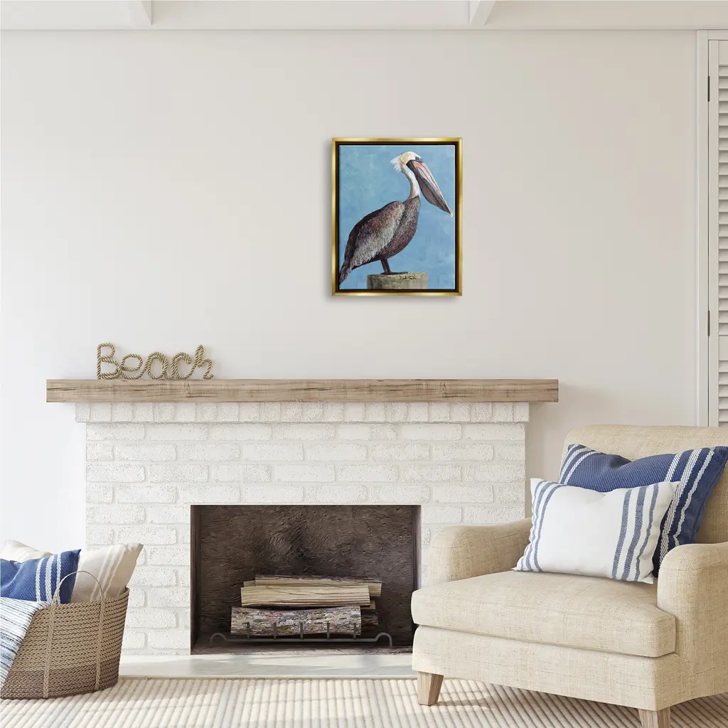 Stupell Blue Pelican Portrait Framed Floater Canvas Wall Art Design By David Sands - 17 X 21 - Gold