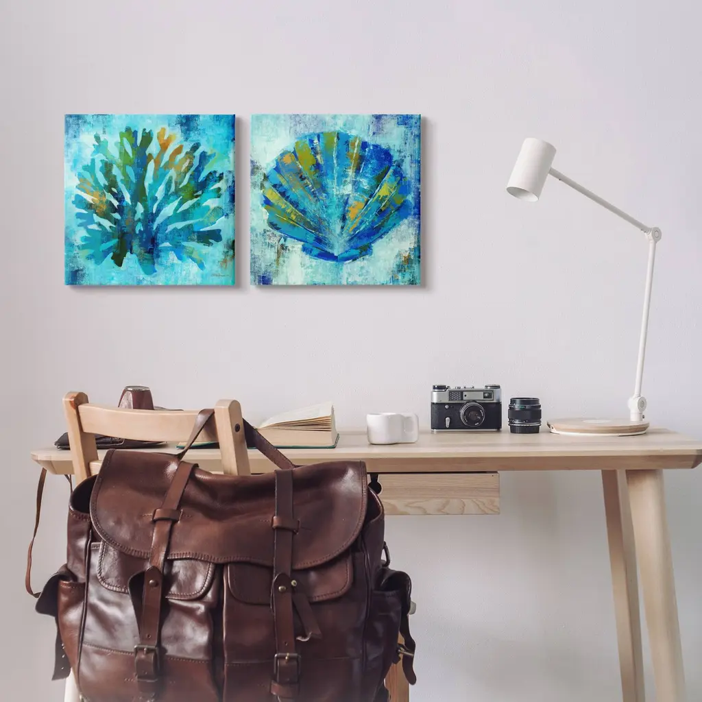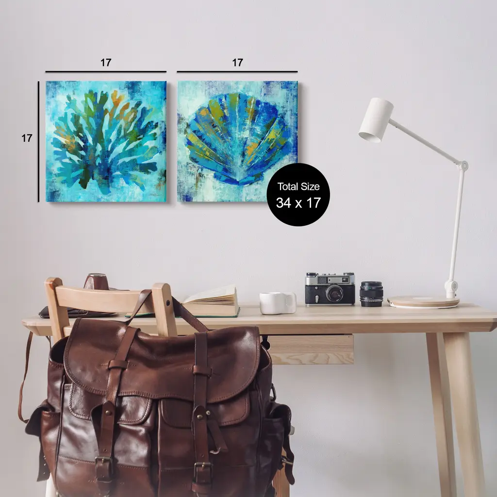 Fill any space with Stupell Wall Art Sets. We create our stretched canvas to the highest standards. Using only the highest quality inks and canvas on Mimaki printers, we hand-cut and stretch each piece over a 1.5-inch thick wooden frame for hanging. As a result, the art comes ready to hang on the sturdy ledge with no installation required. Stupell Wall Art is made in the USA.Features: Dimensions: 2 Piece Set, Each Panel is 17 x 1.5 x 17 InchesStretched Canvas Set Sizes Include Standard: 2pc, Each is 17 x 1.5 x 17 Large: 2pc, Eachis 24 x 1.5 x 24Wall Art is Ready to Hang with Hardware Free Hanging. No installation required. For Easy Set Up Lean or Layer Artwork on Shelf or Against Wall.Our stretched canvas is created with the highest standards. We use only the highest quality inks and canvas on our in house Mimaki printers, and then hand cut and stretch each piece over a 1.5 inch thick wooden frame for hanging. Made In USA.Artwork Relates To: Sea Life, Coral, Seashell, Clam, Blue, AbstractDesign by Liz Jardine
