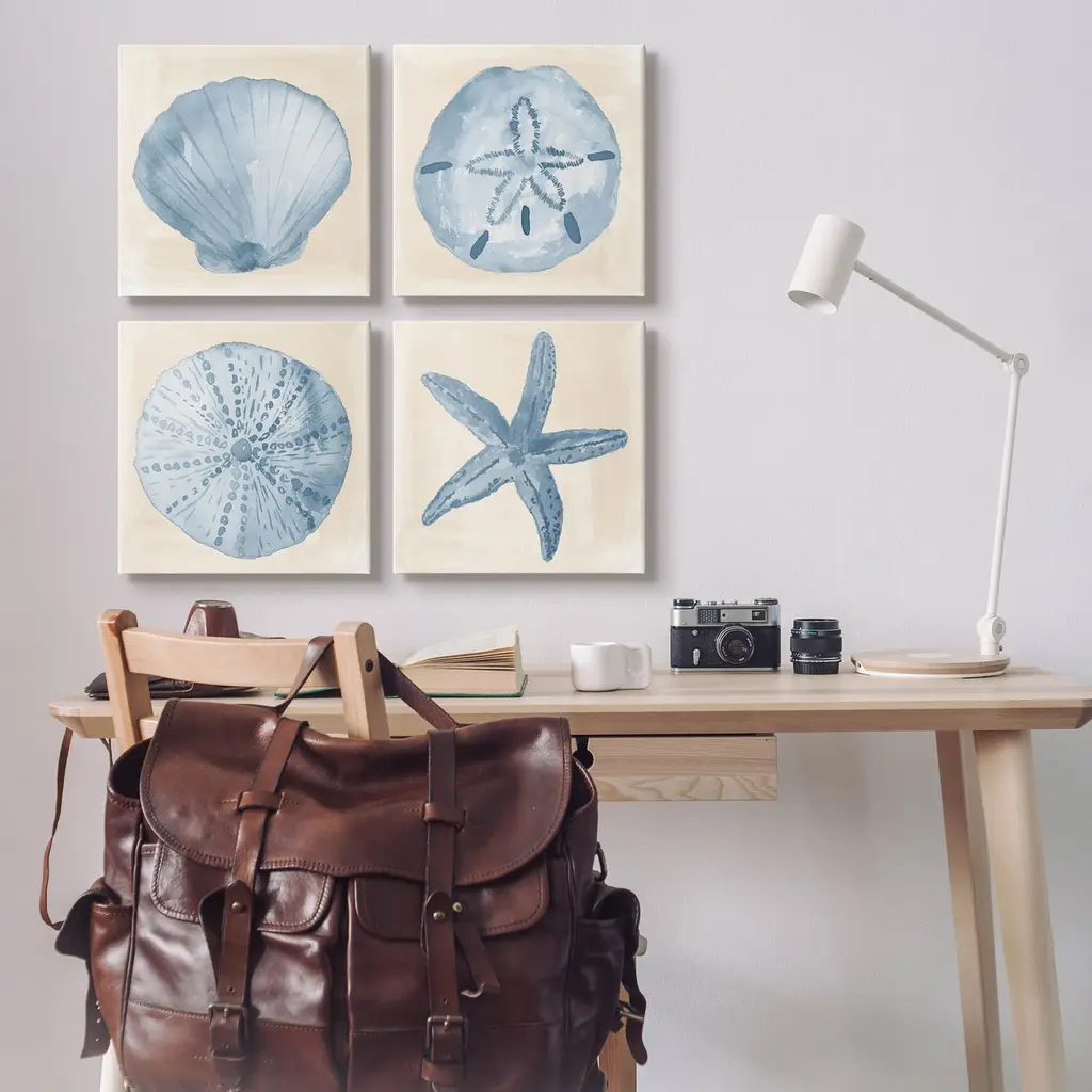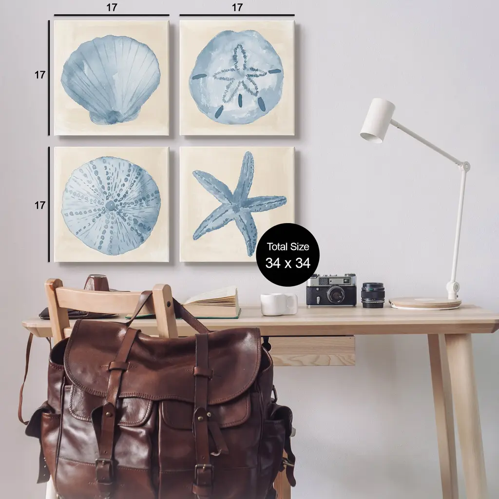 The more the better, right? Multi-Piece Canvas Sets help fill up the entire wall with excitement. Proudly made in the USA, Our stretched canvas is created with the highest standards. We use only the highest quality inks and canvas on our in house printers, and then hand cut and stretch each piece over a 1.5 inch thick wooden frame for hanging. The art comes ready to hang with no installation required.Features: Dimensions: 4 Piece Set, Each Panel is 17 x 1.5 x 17 InchesWall Art is Ready to Hang - No Installation or Hardware Needed. For Easy Set Up Lean or Layer Artwork on Shelf or Against Wall.Our stretched canvas is created with the highest standards. We use only the highest quality inks and canvas on our in house Mimaki printers, and then hand cut and stretch each piece over a 1.5 inch thick wooden frame for hanging. Made In USA.Artwork Relates To: Sea Life, Seashell, Conch, Sand Dollar, Clam, Nautilus, Starfish, Water, PatternDesign by Lucille PriceFirst perfectly in any Living Room, Den, Hallway, Office, Entryway, Study, Dining Room or Bed Room.