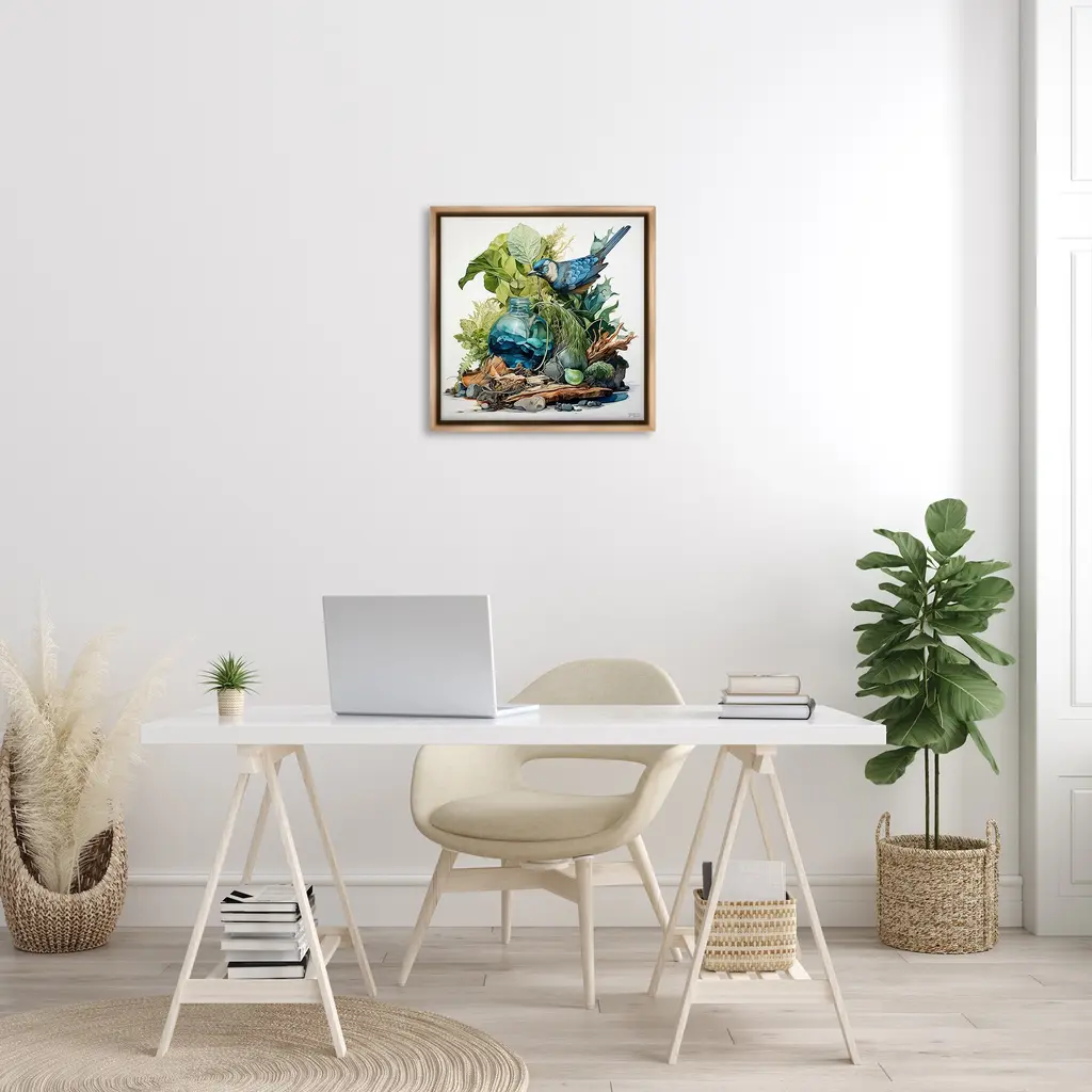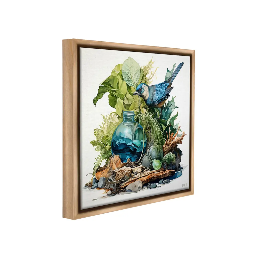 Elevate your home or office to the next level with Stupell Framed Floating Canvas Wall Art. Our premium hand-stretched canvas is mounted securely into a sturdy lightweight frame. The museum-style gap between the wrapped canvas and the box frame gives the illusion of floating artwork. Stupell Wall Art is made in the USA.Features: Dimensions: 18 x 1.7 x 18 Frame, 17 x 1.5 x 17 Canvas ArtFloating Frame Canvas Products are available in sizes 18"x18" and 25"x25". All Floating Frame Canvas Products have a 1.7" Depth.Wall Art is Ready to Hang with Hardware Free Hanging. No Installation required. For Easy Set Up Lean or Layer Artwork on Shelf or Against Wall. Artwork is Permently Fixed into the Frame.Our elevated 1.7" Thick Floating Frame is the perfect complement to our canvas style Wall Art. We use only the highest quality inks in house with industry leading printing solutions. Canvas is hand stretched over a durable wood foundation and then mounted securly into a Modern Box Frame. Made in the USA.Artwork Relates To: Animal, Bird, Jay, Blue Jay, Bluebird, Botanical, Woodland, LeafDesign by RB