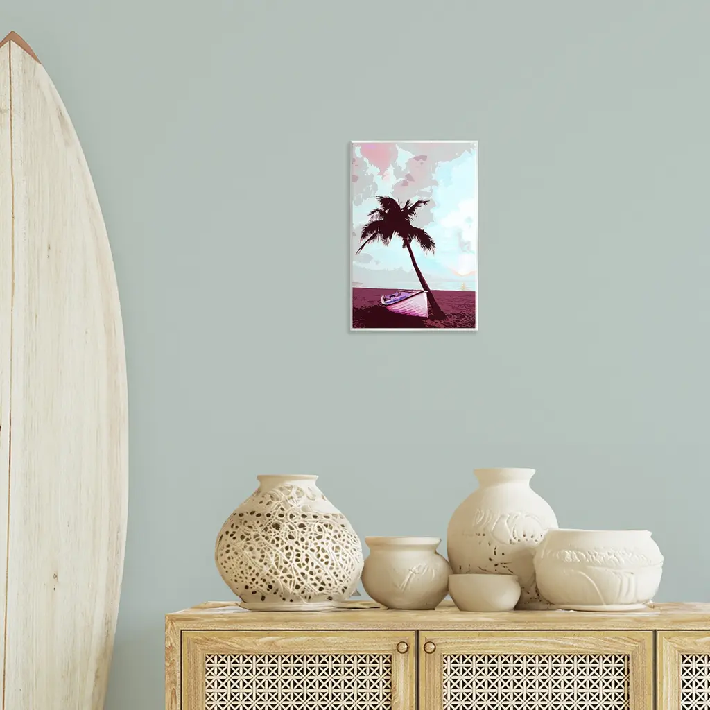 Our wall plaques start as high-quality lithograph prints mounted on durable 0.5-inch thick MDF wood. Each piece is hand finished and comes with a fresh layer of white foil on the sides to give it a crisp, clean look. Plaques arrive ready to hang without installation and come with removable plastic corners to keep them from damage in transit. Stupell Wall Art is made in the USA.Features: Dimensions: 10 x 0.5 x 15 InchesWall Plaque Product Sizes Include 10"x15" and 13"x19". All wall plaque products have a 0.5" Depth. Wall Art is Ready to Hang with Hardware Free Hanging. No installation required. For Easy Set Up Lean or Layer Artwork on Shelf or Against Wall.All of our wall plaques start off as high quality lithograph prints that are then mounted on durable 0.5 inch thick MDF wood. Each piece is hand finished and comes with a fresh layer of foil on the sides to give it a crisp clean look. Made In USA.Artwork Relates To: Palm Tree, Summer, Watercraft, Boat, Nature, Tropical, Beach, CoastDesign by Marcus Prime