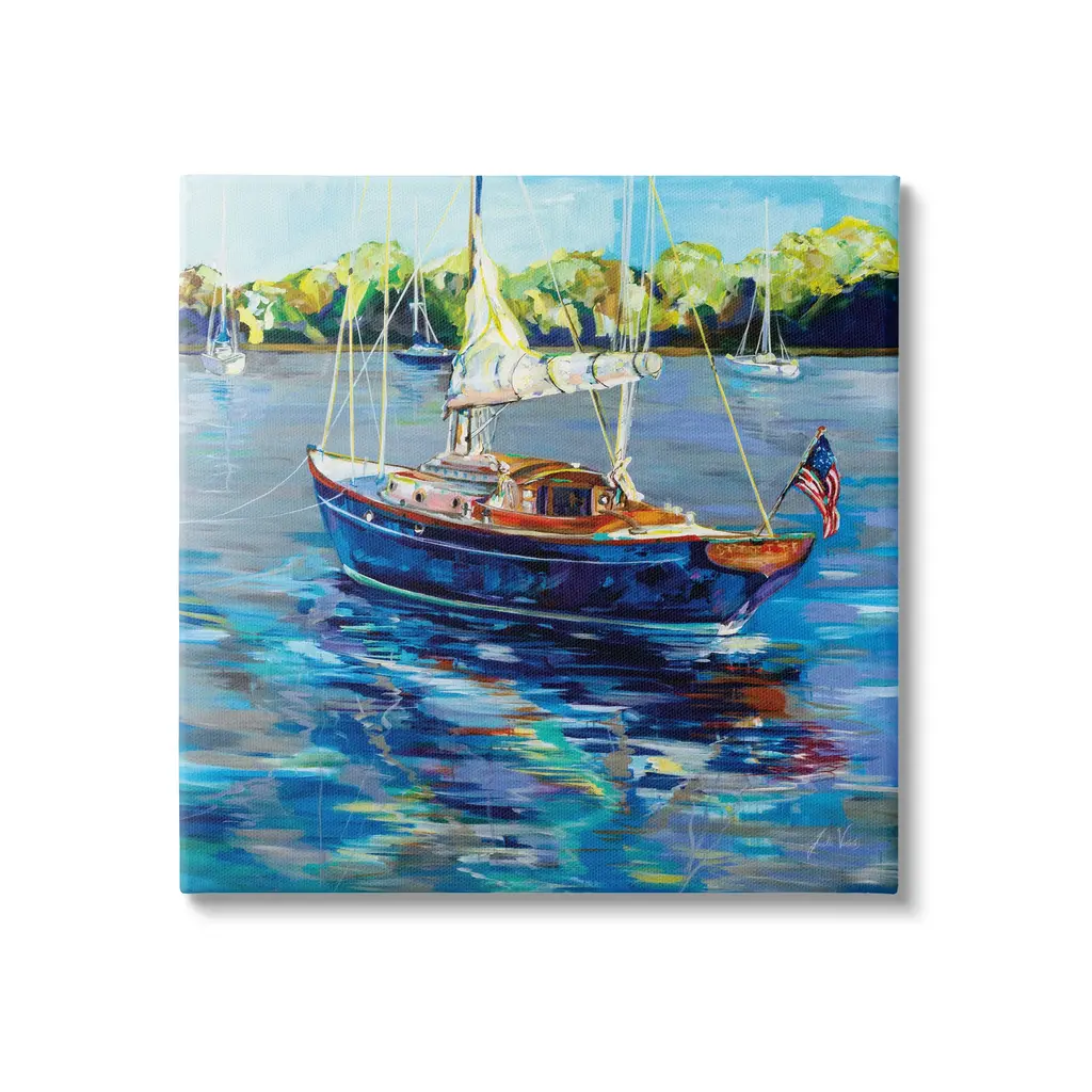 We create our stretched canvas to the highest standards. Using only the highest quality inks and canvas on Mimaki printers, we hand-cut and stretch each piece over a 1.5-inch thick wooden frame for hanging. As a result, the art comes ready to hang on the sturdy ledge with no installation required. Stupell Wall Art is made in the USA.Features: Dimensions: 17 x 1.5 x 17 InchesStretched Canvas Sizes Include Standard: 17 x 1.5 x 17 Large: 24 x 1.5 x 24 X-Large: 30 x 1.5 x 30 Oversized: 36 x 1.5 x 36Wall Art is Ready to Hang with Hardware Free Hanging. No installation required. For Easy Set Up Lean or Layer Artwork on Shelf or Against Wall.Our stretched canvas is created with the highest standards. We use only the highest quality inks and canvas on our in house Mimaki printers, and then hand cut and stretch each piece over a 1.5 inch thick wooden frame for hanging. Made In USA.Artwork Relates To: Boat, Sailboat, Transportation, Vehicle, Painting, Water, Watercraft, Sea, American FlagDesign by Jeanette Vertentes