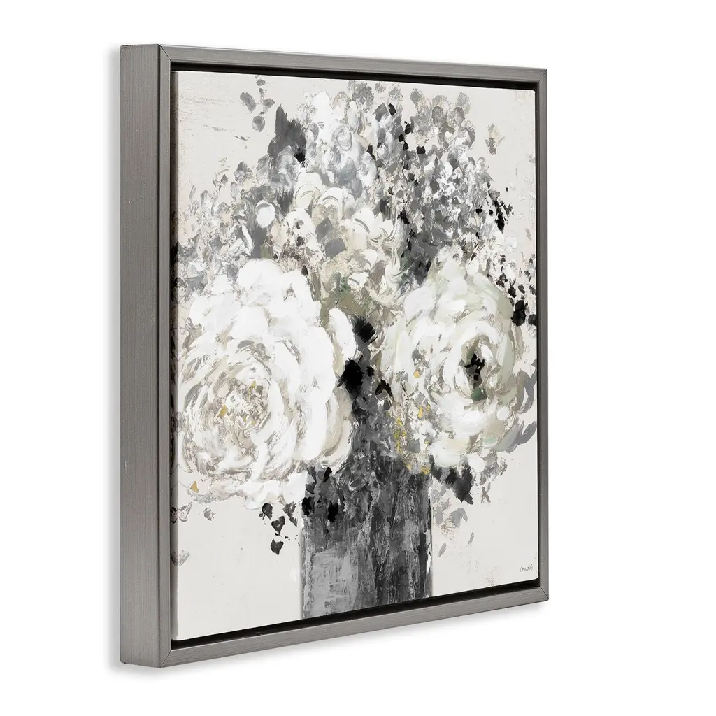 Elevate your home or office to the next level with Stupell Framed Floating Canvas Wall Art. Our premium hand-stretched canvas is mounted securely into a sturdy lightweight frame. The museum-style gap between the wrapped canvas and the box frame gives the illusion of floating artwork. Stupell Wall Art is made in the USA.Features: Dimensions: 18 x 1.7 x 18 Frame, 17 x 1.5 x 17 Canvas ArtFloating Frame Canvas Products are available in sizes 18"x18" and 25"x25". All Floating Frame Canvas Products have a 1.7" Depth.Wall Art is Ready to Hang with Hardware Free Hanging. No Installation required. For Easy Set Up Lean or Layer Artwork on Shelf or Against Wall. Artwork is Permently Fixed into the Frame.Our elevated 1.7" Thick Floating Frame is the perfect complement to our canvas style Wall Art. We use only the highest quality inks in house with industry leading printing solutions. Canvas is hand stretched over a durable wood foundation and then mounted securly into a Modern Box Frame. Made in the USA.Artwork Relates To: Flowers, Abstract, Peonies, Bouquet, Black and White, MonochromeDesign by Lanie Loreth