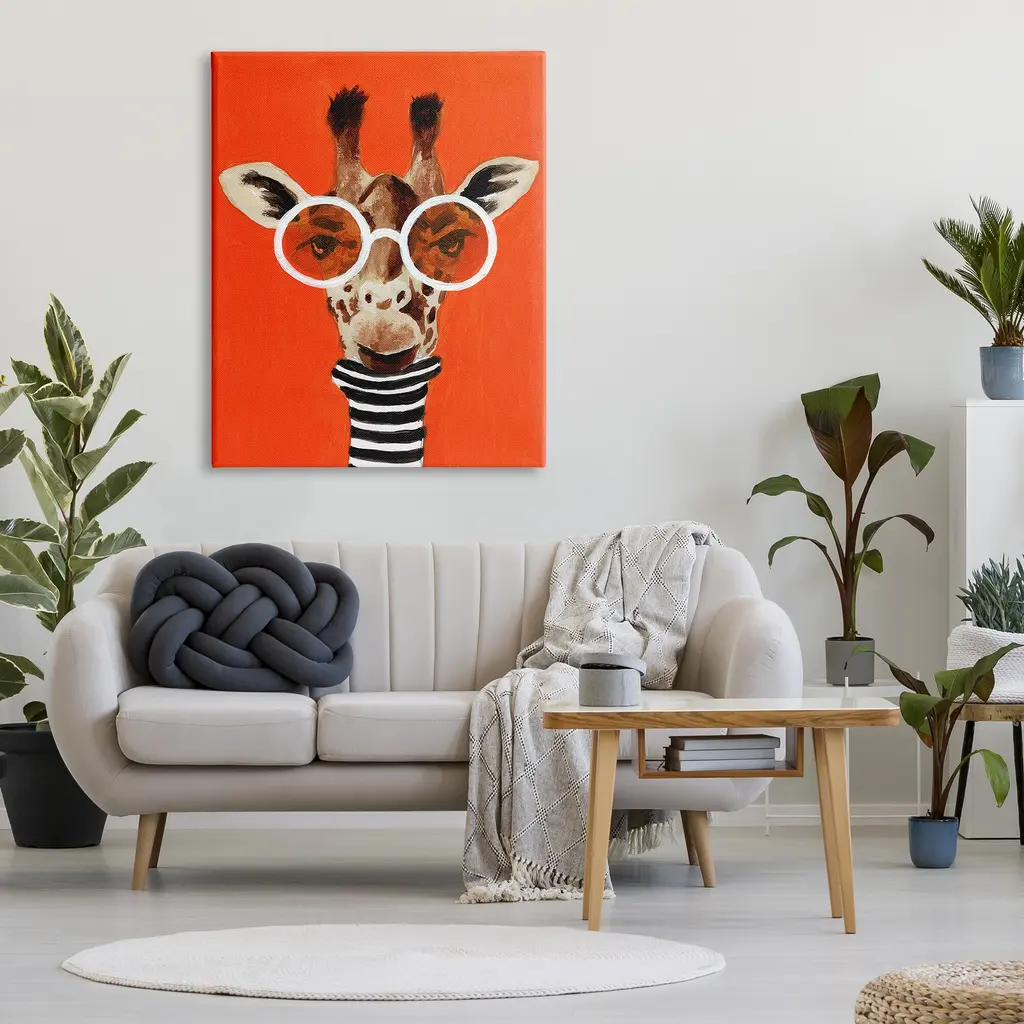 We create our stretched canvas to the highest standards. Using only the highest quality inks and canvas on Mimaki printers, we hand-cut and stretch each piece over a 1.5-inch thick wooden frame for hanging. As a result, the art comes ready to hang on the sturdy ledge with no installation required. Stupell Wall Art is made in the USA.Features: Dimensions: 16 x 1.5 x 20 InchesStretched Canvas Sizes Include Standard: 16 x 1.5 x 20 Large: 20 x 1.5 x 30 X-Large: 30 x 1.5 x 40 Oversized: 36 x 1.5 x 48Wall Art is Ready to Hang - No Installation or Hardware Needed. For Easy Set Up Lean or Layer Artwork on Shelf or Against Wall.Our stretched canvas is created with the highest standards. We use only the highest quality inks and canvas on our in house Mimaki printers, and then hand cut and stretch each piece over a 1.5 inch thick wooden frame for hanging. Made In USA.Artwork Relates To: Painting, Portrait, Animal, Mammal, Wildlife, Giraffe, GlassesDesign by Coco de Paris