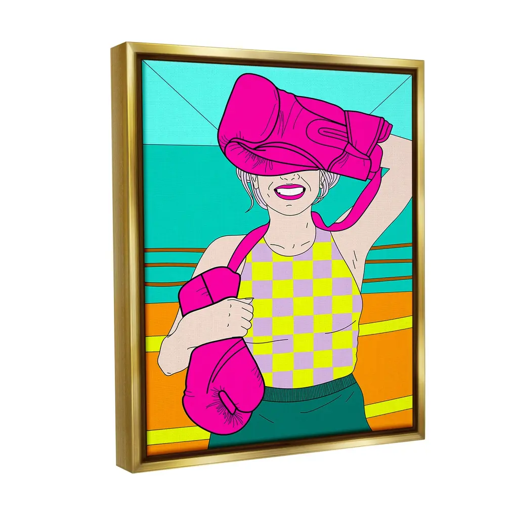 Elevate your home or office to the next level with Stupell Framed Floating Canvas Wall Art. Our premium hand-stretched canvas is mounted securely into a sturdy lightweight frame. The museum-style gap between the wrapped canvas and the box frame gives the illusion of floating artwork. Stupell Wall Art is made in the USA.Features: Dimensions: 17 x 1.7 x 21 Frame, 16 x 1.5 x 20 Canvas ArtFloating Frame Canvas Products are available in sizes 17"x21" and 25"x31". All Floating Frame Canvas Products have a 1.7" Depth.Wall Art is Ready to Hang with Hardware Free Hanging. No Installation required. For Easy Set Up Lean or Layer Artwork on Shelf or Against Wall. Artwork is Permently Fixed into the Frame.Our elevated 1.7" Thick Floating Frame is the perfect complement to our canvas style Wall Art. We use only the highest quality inks in house with industry leading printing solutions. Canvas is hand stretched over a durable wood foundation and then mounted securly into a Modern Box Frame. Made in the USA.Artwork Relates To: Glove, Person, Boxing Glove, Boxing, Boxer, Kickboxing, Exercise, Workout, Woman, Modern, FitnessDesign by Grace Popp