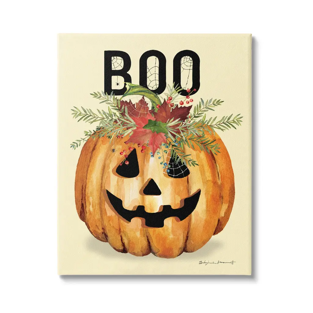 We create our stretched canvas to the highest standards. Using only the highest quality inks and canvas on Mimaki printers, we hand-cut and stretch each piece over a 1.5-inch thick wooden frame for hanging. As a result, the art comes ready to hang on the sturdy ledge with no installation required. Stupell Wall Art is made in the USA.Features: Dimensions: 16 x 1.5 x 20 InchesStretched Canvas Sizes Include Standard: 16 x 1.5 x 20 Large: 20 x 1.5 x 30 X-Large: 30 x 1.5 x 40 Oversized: 36 x 1.5 x 48Wall Art is Ready to Hang - No Installation or Hardware Needed. For Easy Set Up Lean or Layer Artwork on Shelf or Against Wall.Our stretched canvas is created with the highest standards. We use only the highest quality inks and canvas on our in house Mimaki printers, and then hand cut and stretch each piece over a 1.5 inch thick wooden frame for hanging. Made In USA.Artwork Relates To: Plant, Halloween, Pumpkin, Seasonal, Botanical, Jack-o-lantern, Spider Web, BooDesign by Stephanie Workman Marrott