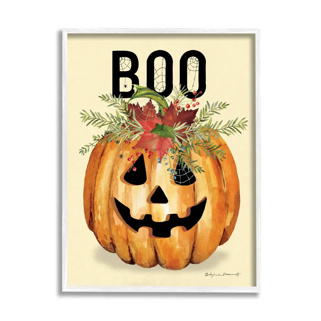 Add dimension to any room with our textured Framed Giclee Artwork. Our framed artwork is securely mounted into a 1.5-inch thick wood grain frame and ready to hang. Frames are available in three alluring styles: black, gray farmhouse and white. In addition, you should check out our oversized options if you want a statement piece. Stupell Wall Art is made in the USA.Features: Dimensions: 11 x 1.5 x 14 FramedFramed Giclee Sizes Include Standard: 11 x 1.5 x 14 Large: 16 x 1.5 x 20 Oversized: 24 x 1.5 x 30Wall Art is Ready to Hang - No Installation or Hardware Needed. For Easy Set Up Lean or Layer Artwork on Shelf or Against Wall.Our giclée prints are carefully mounted on a durable MDF backing, and then perfectly finished in a 1.5 inch thick woodgrain frame. Mounted frame colors include black, gray farmhouse and white. Made In USA.Artwork Relates To: Plant, Halloween, Pumpkin, Seasonal, Botanical, Jack-o-lantern, Spider Web, BooDesign by Stephanie Workman Marrott