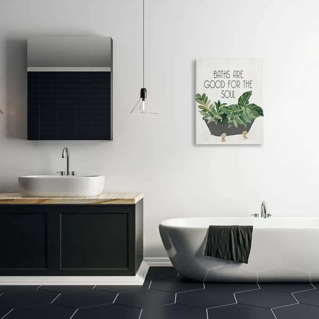 We create our stretched canvas to the highest standards. Using only the highest quality inks and canvas on Mimaki printers, we hand-cut and stretch each piece over a 1.5-inch thick wooden frame for hanging. As a result, the art comes ready to hang on the sturdy ledge with no installation required. Stupell Wall Art is made in the USA.Features: Dimensions: 16 x 1.5 x 20 InchesStretched Canvas Sizes Include Standard: 16 x 1.5 x 20 Large: 20 x 1.5 x 30 X-Large: 30 x 1.5 x 40 Oversized: 36 x 1.5 x 48Wall Art is Ready to Hang with Hardware Free Hanging. No installation required. For Easy Set Up Lean or Layer Artwork on Shelf or Against Wall.Our stretched canvas is created with the highest standards. We use only the highest quality inks and canvas on our in house Mimaki printers, and then hand cut and stretch each piece over a 1.5 inch thick wooden frame for hanging. Made In USA.Artwork Relates To: Plant, Potted Plant, Leaf, Bathroom, Tub, Bathtub, Baths Are Good For The SoulDesign by Lanie Loreth
