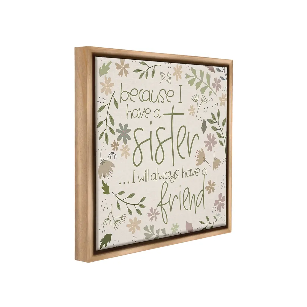 Elevate your home or office to the next level with Stupell Framed Floating Canvas Wall Art. Our premium hand-stretched canvas is mounted securely into a sturdy lightweight frame. The museum-style gap between the wrapped canvas and the box frame gives the illusion of floating artwork. Stupell Wall Art is made in the USA.Features: Dimensions: 18 x 1.7 x 18 Frame, 17 x 1.5 x 17 Canvas ArtFloating Frame Canvas Products are available in sizes 18"x18" and 25"x25". All Floating Frame Canvas Products have a 1.7" Depth.Wall Art is Ready to Hang with Hardware Free Hanging. No Installation required. For Easy Set Up Lean or Layer Artwork on Shelf or Against Wall. Artwork is Permently Fixed into the Frame.Our elevated 1.7" Thick Floating Frame is the perfect complement to our canvas style Wall Art. We use only the highest quality inks in house with industry leading printing solutions. Canvas is hand stretched over a durable wood foundation and then mounted securly into a Modern Box Frame. Made in the USA.Artwork Relates To: Herbs, Plant, Botanical, Phrase, Minimal, Cottage, Sister, Pattern, Because I Have a Sister I Will Always Have a FriendDesign by Mollie B.