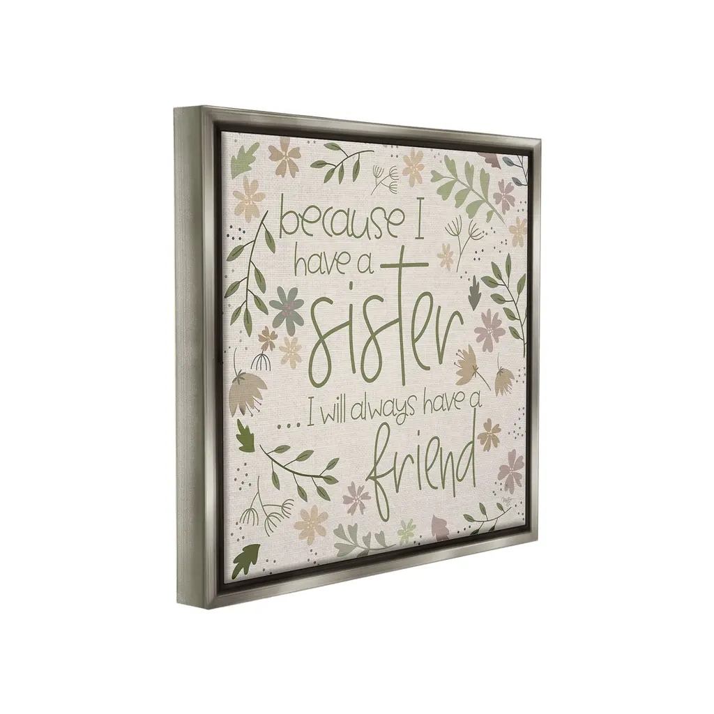 Elevate your home or office to the next level with Stupell Framed Floating Canvas Wall Art. Our premium hand-stretched canvas is mounted securely into a sturdy lightweight frame. The museum-style gap between the wrapped canvas and the box frame gives the illusion of floating artwork. Stupell Wall Art is made in the USA.Features: Dimensions: 18 x 1.7 x 18 Frame, 17 x 1.5 x 17 Canvas ArtFloating Frame Canvas Products are available in sizes 18"x18" and 25"x25". All Floating Frame Canvas Products have a 1.7" Depth.Wall Art is Ready to Hang with Hardware Free Hanging. No Installation required. For Easy Set Up Lean or Layer Artwork on Shelf or Against Wall. Artwork is Permently Fixed into the Frame.Our elevated 1.7" Thick Floating Frame is the perfect complement to our canvas style Wall Art. We use only the highest quality inks in house with industry leading printing solutions. Canvas is hand stretched over a durable wood foundation and then mounted securly into a Modern Box Frame. Made in the USA.Artwork Relates To: Herbs, Plant, Botanical, Phrase, Minimal, Cottage, Sister, Pattern, Because I Have a Sister I Will Always Have a FriendDesign by Mollie B.