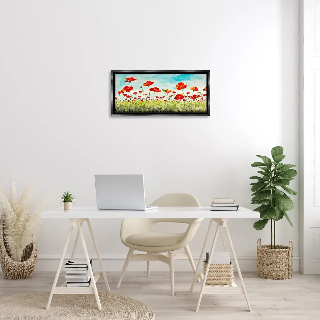 Elevate your home or office to the next level with Stupell Framed Floating Canvas Wall Art. Our premium hand-stretched canvas is mounted securely into a sturdy lightweight frame. The museum-style gap between the wrapped canvas and the box frame gives the illusion of floating artwork. Stupell Wall Art is made in the USA.Features: Dimensions: 25 x 1.7 x 11 Frame, 24 x 1.5 x 10 Canvas ArtFloating Frame Canvas Products are available in sizes 25"x11" and 31"x14". All Floating Frame Canvas Products have a 1.7" Depth.Wall Art is Ready to Hang with Hardware Free Hanging. No Installation required. For Easy Set Up Lean or Layer Artwork on Shelf or Against Wall. Artwork is Permently Fixed into the Frame.Our elevated 1.7" Thick Floating Frame is the perfect complement to our canvas style Wall Art. We use only the highest quality inks in house with industry leading printing solutions. Canvas is hand stretched over a durable wood foundation and then mounted securly into a Modern Box Frame. Made in the USA.Artwork Relates To: Flower, Plant, Painting, Poppy, Grassland, Nature, Field, Grass, Spring, Scenery, MeadowDesign by Julie DeRice