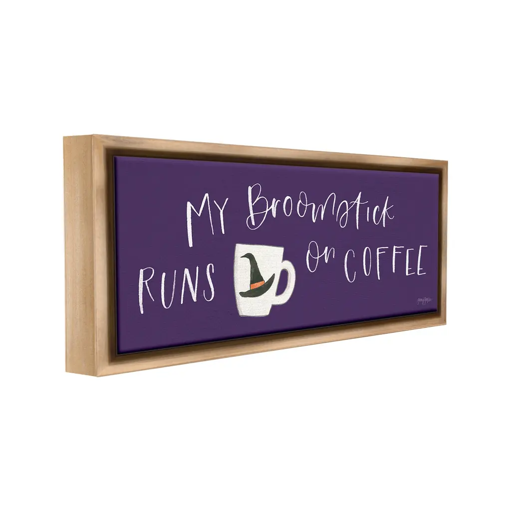 Elevate your home or office to the next level with Stupell Framed Floating Canvas Wall Art. Our premium hand-stretched canvas is mounted securely into a sturdy lightweight frame. The museum-style gap between the wrapped canvas and the box frame gives the illusion of floating artwork. Stupell Wall Art is made in the USA.Features: Dimensions: 25 x 1.7 x 11 Frame, 24 x 1.5 x 10 Canvas ArtFloating Frame Canvas Products are available in sizes 25"x11" and 31"x14". All Floating Frame Canvas Products have a 1.7" Depth.Wall Art is Ready to Hang with Hardware Free Hanging. No Installation required. For Easy Set Up Lean or Layer Artwork on Shelf or Against Wall. Artwork is Permently Fixed into the Frame.Our elevated 1.7" Thick Floating Frame is the perfect complement to our canvas style Wall Art. We use only the highest quality inks in house with industry leading printing solutions. Canvas is hand stretched over a durable wood foundation and then mounted securly into a Modern Box Frame. Made in the USA.Artwork Relates To: Halloween, Holiday, Autumn, Coffee, Mug, Witch, My Broomstick Runs on CoffeeDesign by Jenaya Jackson