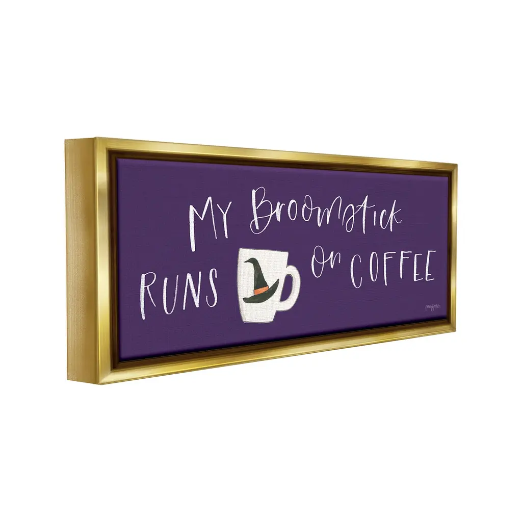 Elevate your home or office to the next level with Stupell Framed Floating Canvas Wall Art. Our premium hand-stretched canvas is mounted securely into a sturdy lightweight frame. The museum-style gap between the wrapped canvas and the box frame gives the illusion of floating artwork. Stupell Wall Art is made in the USA.Features: Dimensions: 25 x 1.7 x 11 Frame, 24 x 1.5 x 10 Canvas ArtFloating Frame Canvas Products are available in sizes 25"x11" and 31"x14". All Floating Frame Canvas Products have a 1.7" Depth.Wall Art is Ready to Hang with Hardware Free Hanging. No Installation required. For Easy Set Up Lean or Layer Artwork on Shelf or Against Wall. Artwork is Permently Fixed into the Frame.Our elevated 1.7" Thick Floating Frame is the perfect complement to our canvas style Wall Art. We use only the highest quality inks in house with industry leading printing solutions. Canvas is hand stretched over a durable wood foundation and then mounted securly into a Modern Box Frame. Made in the USA.Artwork Relates To: Halloween, Holiday, Autumn, Coffee, Mug, Witch, My Broomstick Runs on CoffeeDesign by Jenaya Jackson