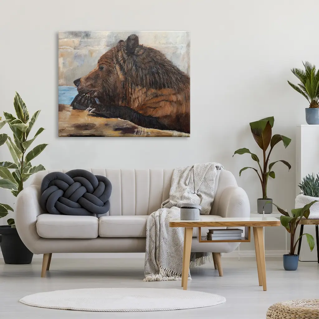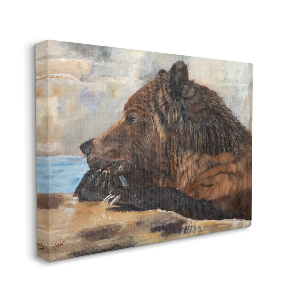 Proudly made in the USA, Our stretched canvas is created with the highest standards. We use only the highest quality inks and canvas on our in house Mimaki printers, and then hand cut and stretch each piece over a 1.5 inch thick wooden frame for hanging. The art comes ready to hang with no installation required. Room Type: Living Room, Den, Hallway, Office, Entryway, Study, Dining Room or Bedroom, Guest Room, Studio, Dorm or BoudoirFeatures: Dimensions: 20 x 1.5 x 16 InchesStretched Canvas Sizes Include Standard: 20 x 1.5 x 16 Large: 30 x 1.5 x 20 X-Large: 40 x 1.5 x 30 Oversized: 48 x 1.5 x 36Wall Art is Ready to Hang - No Installation or Hardware Needed. For Easy Set Up Lean or Layer Artwork on Shelf or Against Wall.Our stretched canvas is created with the highest standards. We use only the highest quality inks and canvas on our in house Mimaki printers, and then hand cut and stretch each piece over a 1.5 inch thick wooden frame for hanging. Made In USA.Artwork Relates To: Animal, Bear, Mammal, Wildlife, Brown Bear, PaintingDesign by Kathy Winkler