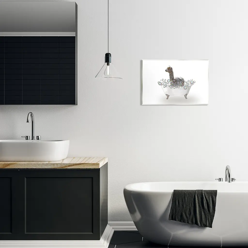 Our wall plaques start as high-quality lithograph prints mounted on durable 0.5-inch thick MDF wood. Each piece is hand finished and comes with a fresh layer of white foil on the sides to give it a crisp, clean look. Plaques arrive ready to hang without installation and come with removable plastic corners to keep them from damage in transit. Stupell Wall Art is made in the USA.Features: Dimensions: 15 x 0.5 x 10 InchesWall Plaque Sizes Include Standard: 15 x 0.5 x 10 Oversized: 19 x 0.5 x 13Wall Art is Ready to Hang with Hardware Free Hanging. No installation required. For Easy Set Up Lean or Layer Artwork on Shelf or Against Wall.All of our wall plaques start off as high quality lithograph prints that are then mounted on durable 0.5 inch thick MDF wood. Each piece is hand finished and comes with a fresh layer of foil on the sides to give it a crisp clean look. Made In USA.Artwork Relates To: Bathing, Bathtub, Tub, Pattern, Bathroom, Bubbles, LlamaDesign by Amelia Noyes