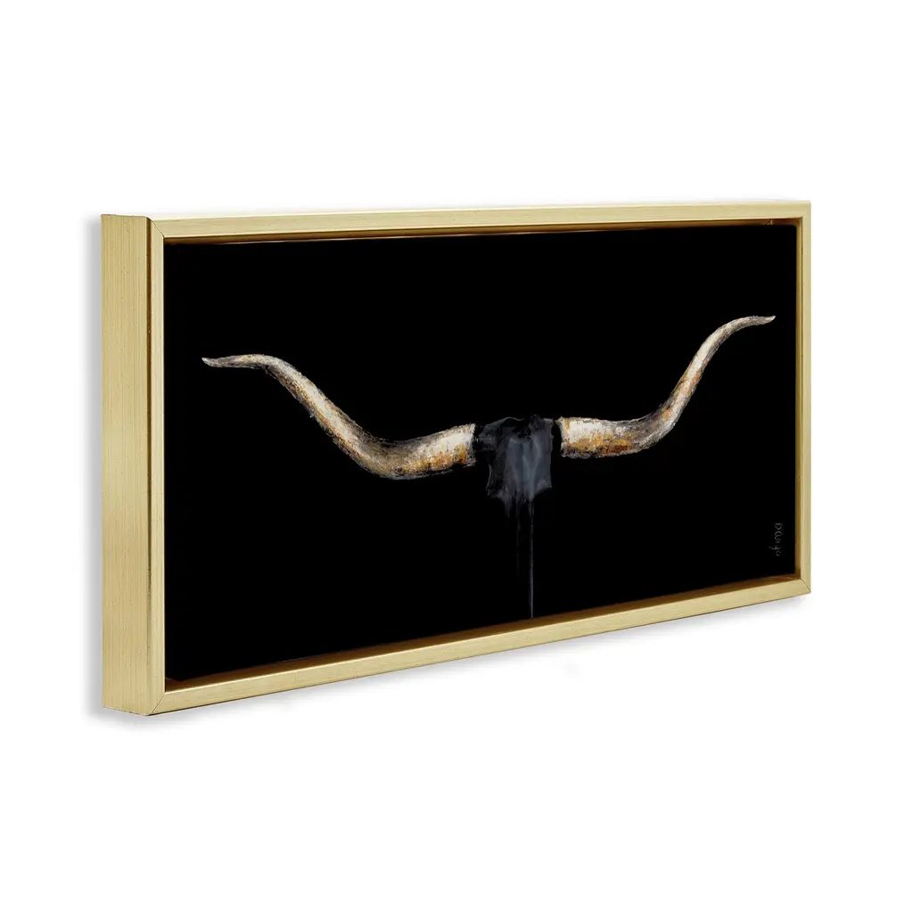 Elevate your home or office to the next level with Stupell Framed Floating Canvas Wall Art. Our premium hand-stretched canvas is mounted securely into a sturdy lightweight frame. The museum-style gap between the wrapped canvas and the box frame gives the illusion of floating artwork. Stupell Wall Art is made in the USA.Features: Dimensions: 25 x 1.7 x 11 Frame, 24 x 1.5 x 10 Canvas ArtFloating Frame Canvas Products are available in sizes 25"x11" and 31"x14". All Floating Frame Canvas Products have a 1.7" Depth.Wall Art is Ready to Hang with Hardware Free Hanging. No Installation required. For Easy Set Up Lean or Layer Artwork on Shelf or Against Wall. Artwork is Permently Fixed into the Frame.Our elevated 1.7" Thick Floating Frame is the perfect complement to our canvas style Wall Art. We use only the highest quality inks in house with industry leading printing solutions. Canvas is hand stretched over a durable wood foundation and then mounted securly into a Modern Box Frame. Made in the USA.Artwork Relates To: Black, Dark, Horns, Antlers, Animal, Cow, Longhorn, Farmhouse, Southwestern, BullDesign by Dina D'Argo