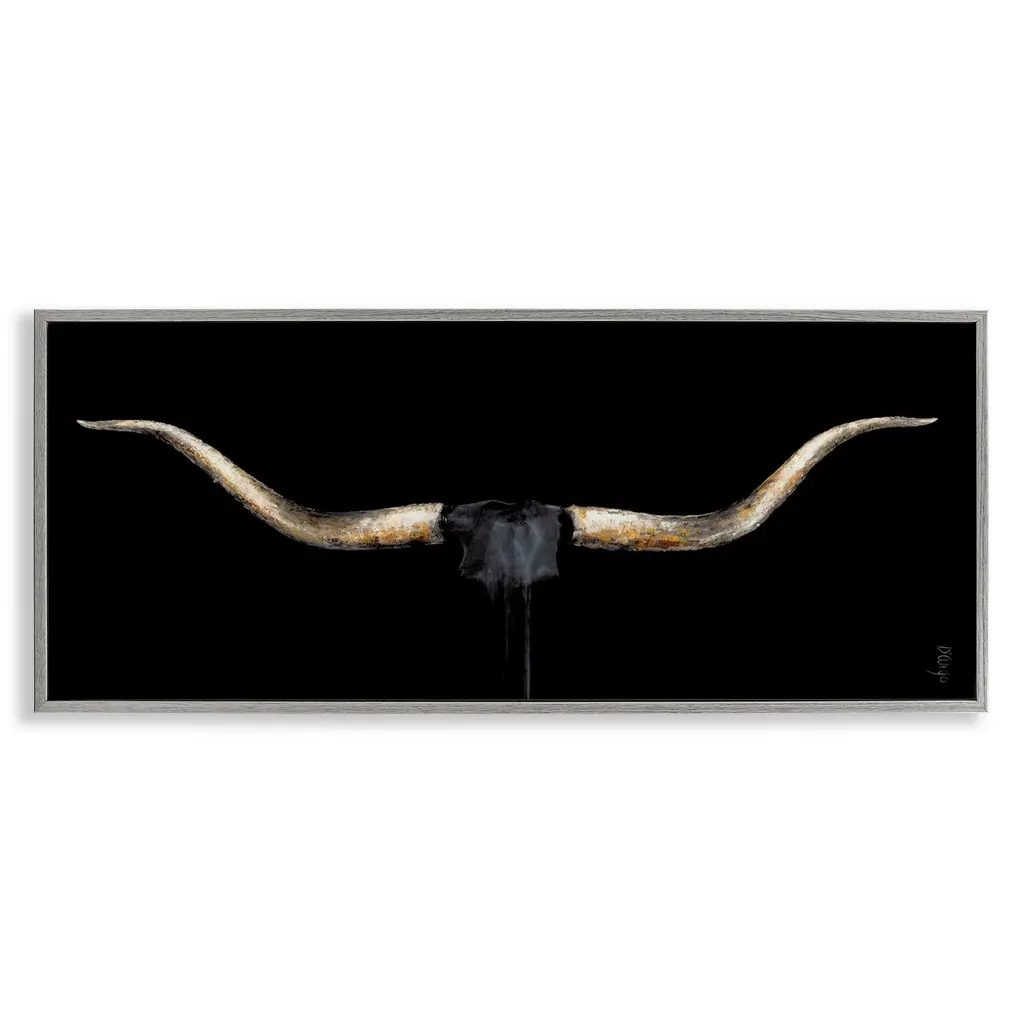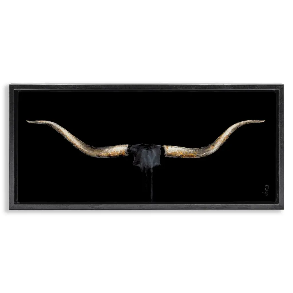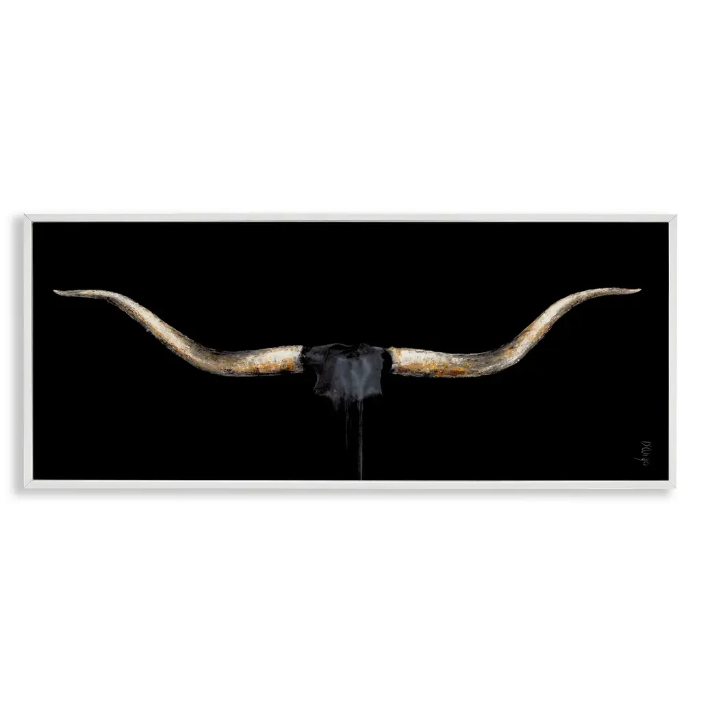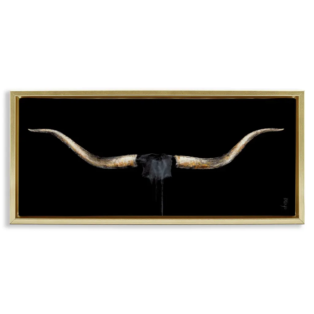 Elevate your home or office to the next level with Stupell Framed Floating Canvas Wall Art. Our premium hand-stretched canvas is mounted securely into a sturdy lightweight frame. The museum-style gap between the wrapped canvas and the box frame gives the illusion of floating artwork. Stupell Wall Art is made in the USA.Features: Dimensions: 25 x 1.7 x 11 Frame, 24 x 1.5 x 10 Canvas ArtFloating Frame Canvas Products are available in sizes 25"x11" and 31"x14". All Floating Frame Canvas Products have a 1.7" Depth.Wall Art is Ready to Hang with Hardware Free Hanging. No Installation required. For Easy Set Up Lean or Layer Artwork on Shelf or Against Wall. Artwork is Permently Fixed into the Frame.Our elevated 1.7" Thick Floating Frame is the perfect complement to our canvas style Wall Art. We use only the highest quality inks in house with industry leading printing solutions. Canvas is hand stretched over a durable wood foundation and then mounted securly into a Modern Box Frame. Made in the USA.Artwork Relates To: Black, Dark, Horns, Antlers, Animal, Cow, Longhorn, Farmhouse, Southwestern, BullDesign by Dina D'Argo