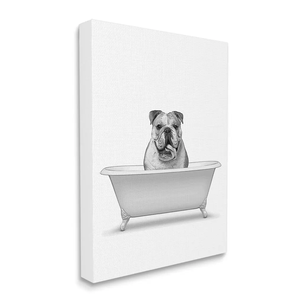 We create our stretched canvas to the highest standards. Using only the highest quality inks and canvas on Mimaki printers, we hand-cut and stretch each piece over a 1.5-inch thick wooden frame for hanging. As a result, the art comes ready to hang on the sturdy ledge with no installation required. Stupell Wall Art is made in the USA.Features: Dimensions: 16 x 1.5 x 20 InchesStretched Canvas Sizes Include Standard: 16 x 1.5 x 20 Large: 20 x 1.5 x 30 X-Large: 30 x 1.5 x 40 Oversized: 36 x 1.5 x 48Wall Art is Ready to Hang - No Installation or Hardware Needed. For Easy Set Up Lean or Layer Artwork on Shelf or Against Wall.Our stretched canvas is created with the highest standards. We use only the highest quality inks and canvas on our in house Mimaki printers, and then hand cut and stretch each piece over a 1.5 inch thick wooden frame for hanging. Made In USA.Artwork Relates To: Animal, Mammal, Wildlife, Bathroom, Dog, BulldogDesign by Annalisa Latella