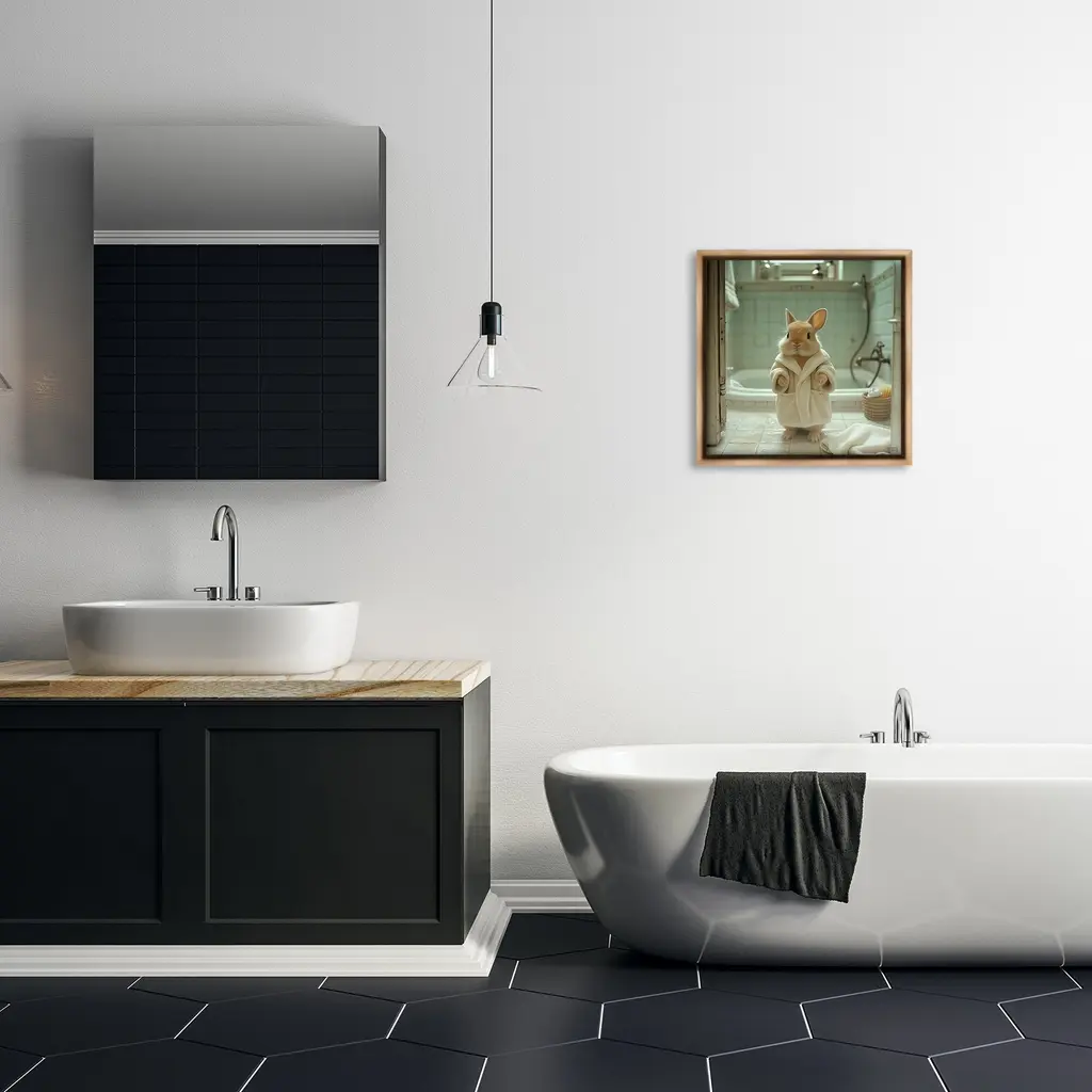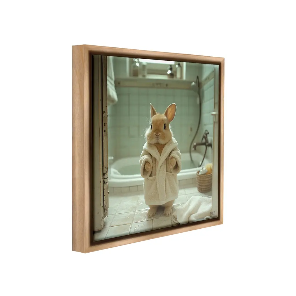 Elevate your home or office to the next level with Stupell Framed Floating Canvas Wall Art. Our premium hand-stretched canvas is mounted securely into a sturdy lightweight frame. The museum-style gap between the wrapped canvas and the box frame gives the illusion of floating artwork. Stupell Wall Art is made in the USA.Features: Dimensions: 18 x 1.7 x 18 Frame, 17 x 1.5 x 17 Canvas ArtFloating Frame Canvas Products are available in sizes 18"x18" and 25"x25". All Floating Frame Canvas Products have a 1.7" Depth.Wall Art is Ready to Hang with Hardware Free Hanging. No Installation required. For Easy Set Up Lean or Layer Artwork on Shelf or Against Wall. Artwork is Permently Fixed into the Frame.Our elevated 1.7" Thick Floating Frame is the perfect complement to our canvas style Wall Art. We use only the highest quality inks in house with industry leading printing solutions. Canvas is hand stretched over a durable wood foundation and then mounted securly into a Modern Box Frame. Made in the USA.Artwork Relates To: Tub, Bathing, Bathtub, Bathroom, Animal, Rabbit, Bunny, RobeDesign by RB