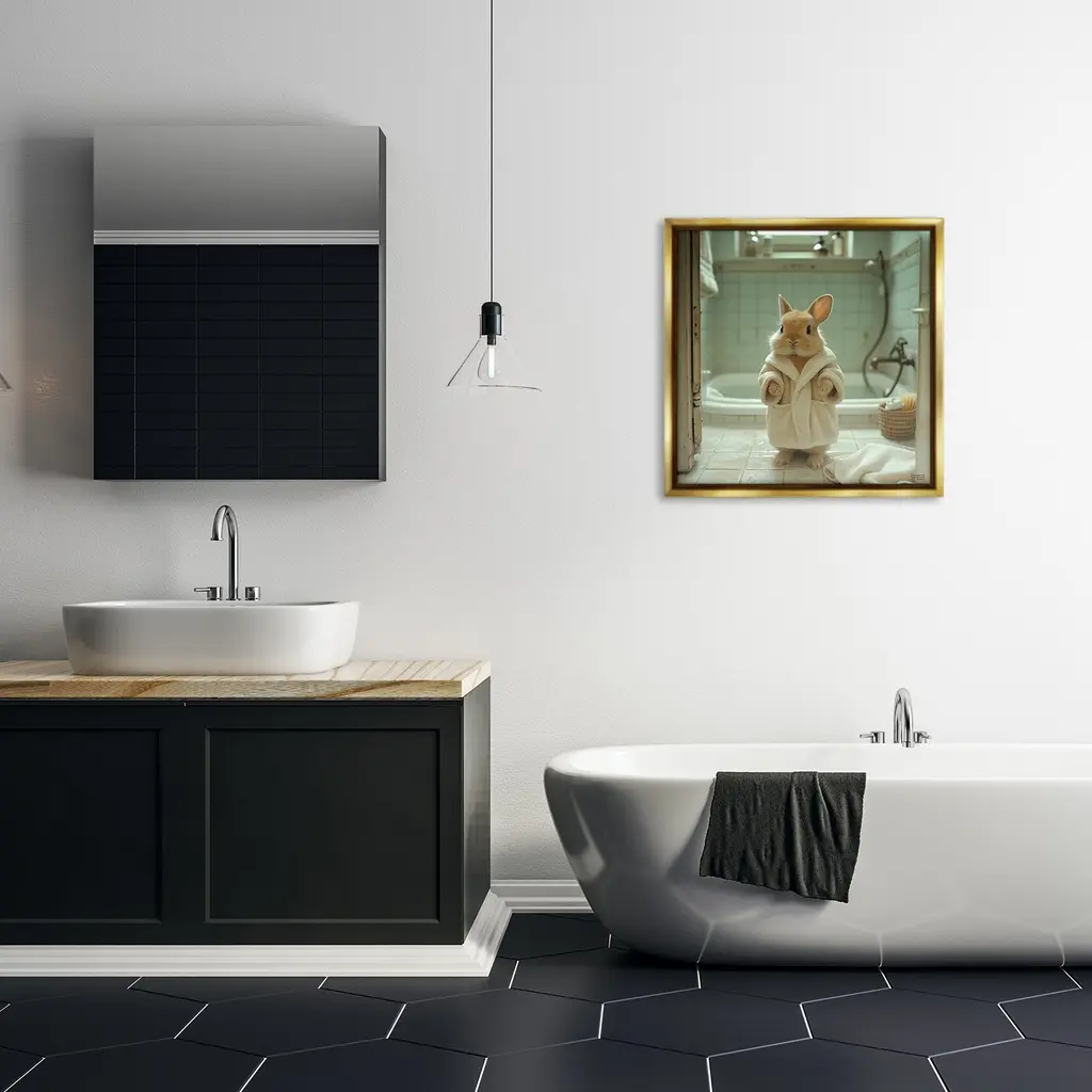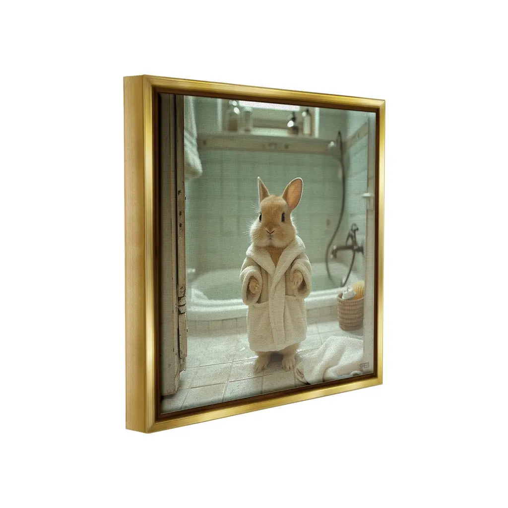 Elevate your home or office to the next level with Stupell Framed Floating Canvas Wall Art. Our premium hand-stretched canvas is mounted securely into a sturdy lightweight frame. The museum-style gap between the wrapped canvas and the box frame gives the illusion of floating artwork. Stupell Wall Art is made in the USA.Features: Dimensions: 18 x 1.7 x 18 Frame, 17 x 1.5 x 17 Canvas ArtFloating Frame Canvas Products are available in sizes 18"x18" and 25"x25". All Floating Frame Canvas Products have a 1.7" Depth.Wall Art is Ready to Hang with Hardware Free Hanging. No Installation required. For Easy Set Up Lean or Layer Artwork on Shelf or Against Wall. Artwork is Permently Fixed into the Frame.Our elevated 1.7" Thick Floating Frame is the perfect complement to our canvas style Wall Art. We use only the highest quality inks in house with industry leading printing solutions. Canvas is hand stretched over a durable wood foundation and then mounted securly into a Modern Box Frame. Made in the USA.Artwork Relates To: Tub, Bathing, Bathtub, Bathroom, Animal, Rabbit, Bunny, RobeDesign by RB