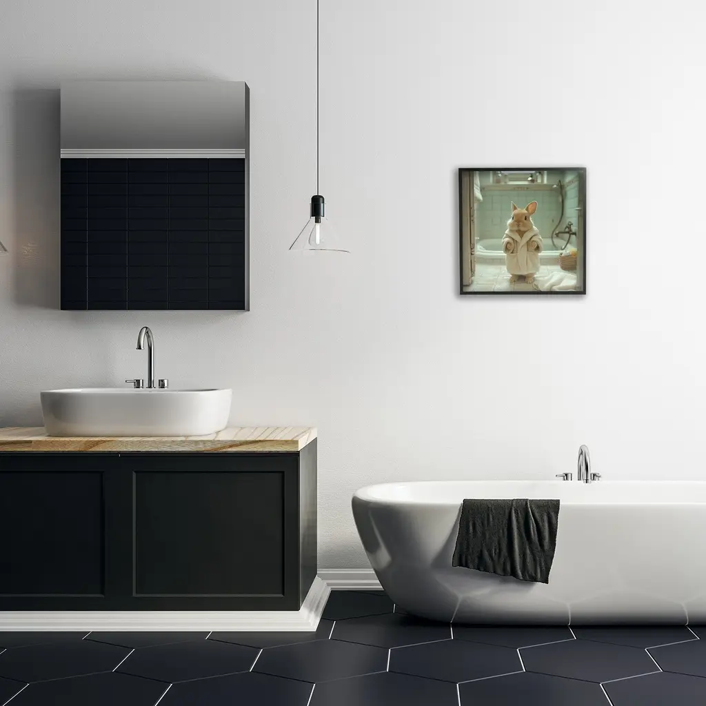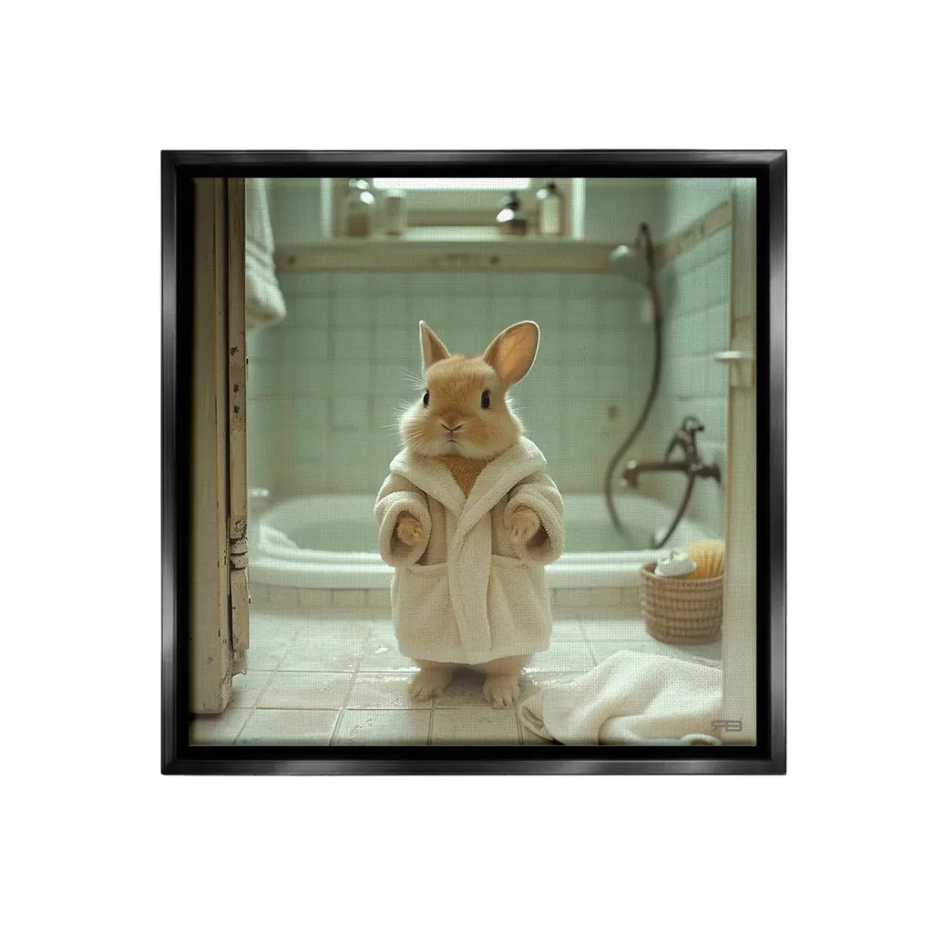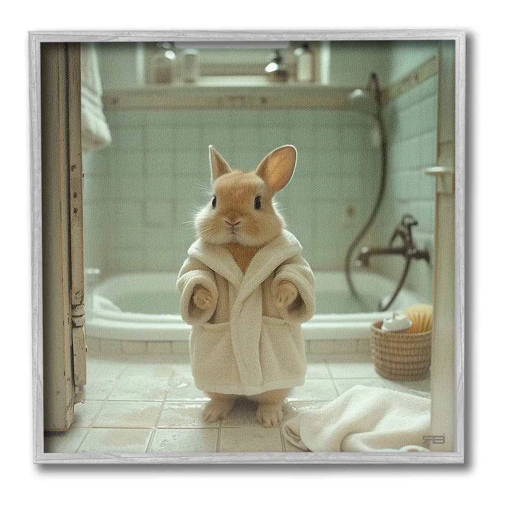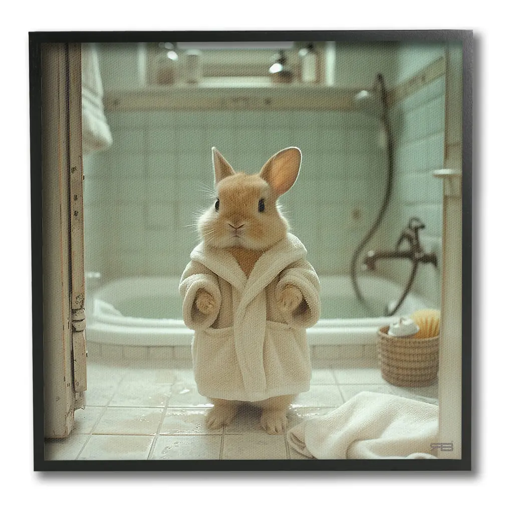 Add dimension to any room with our textured Framed Giclee Artwork. Our framed artwork is securely mounted into a 1.5-inch thick wood grain frame and ready to hang. Frames are available in three alluring styles: black, gray farmhouse and white. In addition, you should check out our oversized options if you want a statement piece. Stupell Wall Art is made in the USA.Features: Dimensions: 12 x 1.5 x 12 FramedFramed Giclee Product Sizes Include 12"x12", 17"x17", and 24"x24". Framed Giclee Products have a 1.5" Depth. Wall Art is Ready to Hang with Hardware Free Hanging. No installation required. For Easy Set Up Lean or Layer Artwork on Shelf or Against Wall.Our giclée prints are carefully mounted on a durable MDF backing, and then perfectly finished in a 1.5 inch thick woodgrain frame. Mounted frame colors include black, gray farmhouse and white. Made In USA.Artwork Relates To: Tub, Bathing, Bathtub, Bathroom, Animal, Rabbit, Bunny, RobeDesign by RB