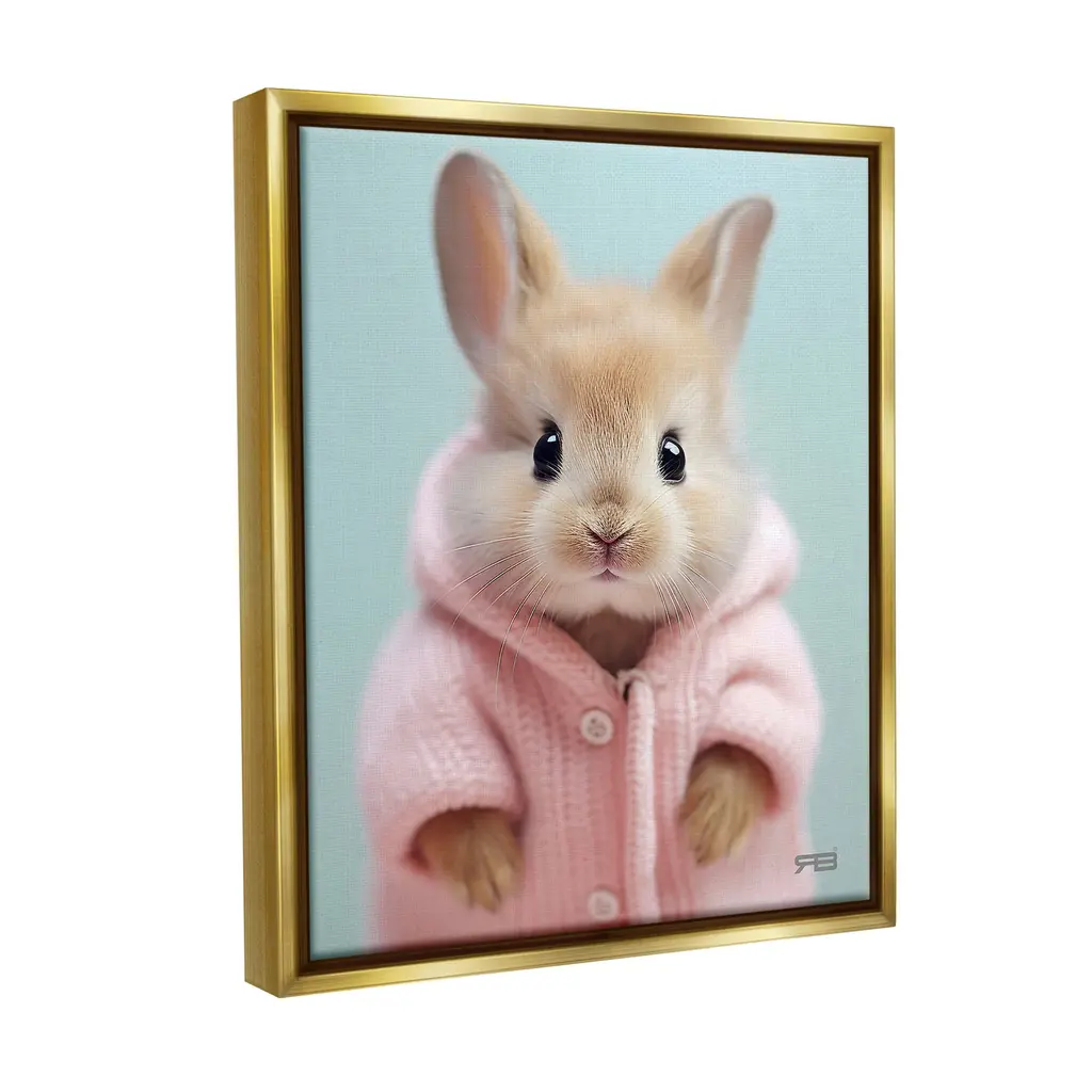 Elevate your home or office to the next level with Stupell Framed Floating Canvas Wall Art. Our premium hand-stretched canvas is mounted securely into a sturdy lightweight frame. The museum-style gap between the wrapped canvas and the box frame gives the illusion of floating artwork. Stupell Wall Art is made in the USA.Features: Dimensions: 17 x 1.7 x 21 Frame, 16 x 1.5 x 20 Canvas ArtFloating Frame Canvas Products are available in sizes 17"x21" and 25"x31". All Floating Frame Canvas Products have a 1.7" Depth.Wall Art is Ready to Hang with Hardware Free Hanging. No Installation required. For Easy Set Up Lean or Layer Artwork on Shelf or Against Wall. Artwork is Permently Fixed into the Frame.Our elevated 1.7" Thick Floating Frame is the perfect complement to our canvas style Wall Art. We use only the highest quality inks in house with industry leading printing solutions. Canvas is hand stretched over a durable wood foundation and then mounted securly into a Modern Box Frame. Made in the USA.Artwork Relates To: Animal, Mammal, Rabbit, Sweater, Pet, Bunny, Cozy, CuddleDesign by RB
