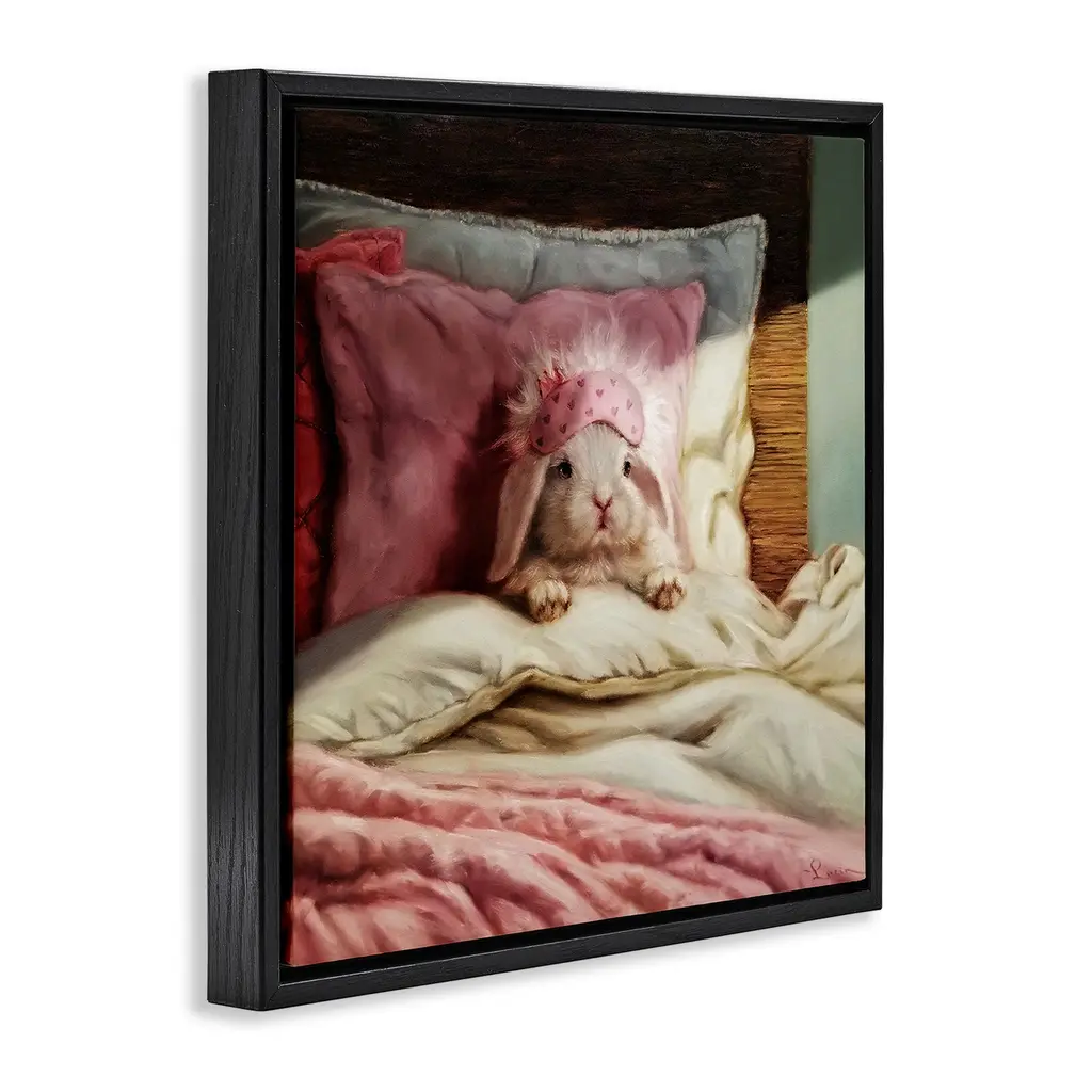 Elevate your home or office to the next level with Stupell Framed Floating Canvas Wall Art. Our premium hand-stretched canvas is mounted securely into a sturdy lightweight frame. The museum-style gap between the wrapped canvas and the box frame gives the illusion of floating artwork. Stupell Wall Art is made in the USA.Features: Dimensions: 18 x 1.7 x 18 Frame, 17 x 1.5 x 17 Canvas ArtFloating Frame Canvas Products are available in sizes 18"x18" and 25"x25". All Floating Frame Canvas Products have a 1.7" Depth.Wall Art is Ready to Hang with Hardware Free Hanging. No Installation required. For Easy Set Up Lean or Layer Artwork on Shelf or Against Wall. Artwork is Permently Fixed into the Frame.Our elevated 1.7" Thick Floating Frame is the perfect complement to our canvas style Wall Art. We use only the highest quality inks in house with industry leading printing solutions. Canvas is hand stretched over a durable wood foundation and then mounted securly into a Modern Box Frame. Made in the USA.Artwork Relates To: Animal, Relax, Bed, Cozy, Bedroom, Rabbit, Bunny, SleepDesign by Lucia Heffernan
