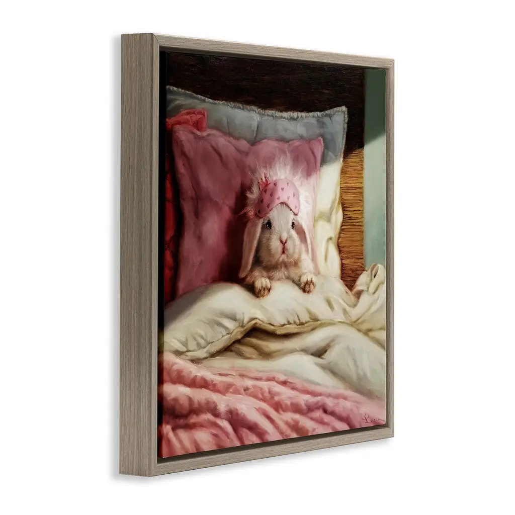Elevate your home or office to the next level with Stupell Framed Floating Canvas Wall Art. Our premium hand-stretched canvas is mounted securely into a sturdy lightweight frame. The museum-style gap between the wrapped canvas and the box frame gives the illusion of floating artwork. Stupell Wall Art is made in the USA.Features: Dimensions: 18 x 1.7 x 18 Frame, 17 x 1.5 x 17 Canvas ArtFloating Frame Canvas Products are available in sizes 18"x18" and 25"x25". All Floating Frame Canvas Products have a 1.7" Depth.Wall Art is Ready to Hang with Hardware Free Hanging. No Installation required. For Easy Set Up Lean or Layer Artwork on Shelf or Against Wall. Artwork is Permently Fixed into the Frame.Our elevated 1.7" Thick Floating Frame is the perfect complement to our canvas style Wall Art. We use only the highest quality inks in house with industry leading printing solutions. Canvas is hand stretched over a durable wood foundation and then mounted securly into a Modern Box Frame. Made in the USA.Artwork Relates To: Animal, Relax, Bed, Cozy, Bedroom, Rabbit, Bunny, SleepDesign by Lucia Heffernan
