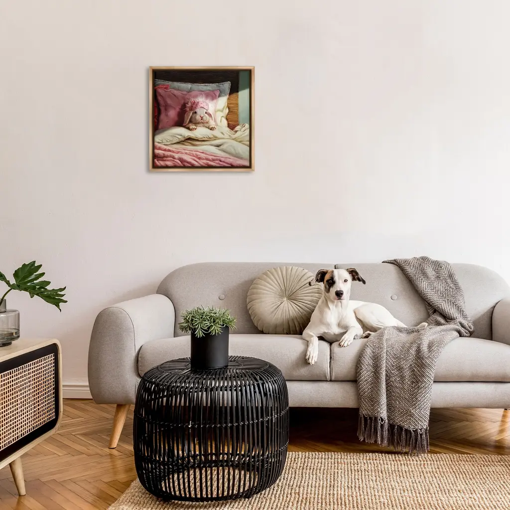 Elevate your home or office to the next level with Stupell Framed Floating Canvas Wall Art. Our premium hand-stretched canvas is mounted securely into a sturdy lightweight frame. The museum-style gap between the wrapped canvas and the box frame gives the illusion of floating artwork. Stupell Wall Art is made in the USA.Features: Dimensions: 18 x 1.7 x 18 Frame, 17 x 1.5 x 17 Canvas ArtFloating Frame Canvas Products are available in sizes 18"x18" and 25"x25". All Floating Frame Canvas Products have a 1.7" Depth.Wall Art is Ready to Hang with Hardware Free Hanging. No Installation required. For Easy Set Up Lean or Layer Artwork on Shelf or Against Wall. Artwork is Permently Fixed into the Frame.Our elevated 1.7" Thick Floating Frame is the perfect complement to our canvas style Wall Art. We use only the highest quality inks in house with industry leading printing solutions. Canvas is hand stretched over a durable wood foundation and then mounted securly into a Modern Box Frame. Made in the USA.Artwork Relates To: Animal, Relax, Bed, Cozy, Bedroom, Rabbit, Bunny, SleepDesign by Lucia Heffernan