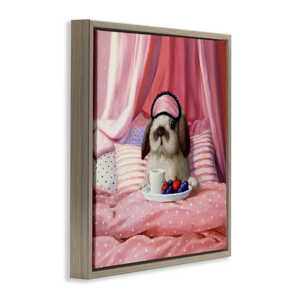 Elevate your home or office to the next level with Stupell Framed Floating Canvas Wall Art. Our premium hand-stretched canvas is mounted securely into a sturdy lightweight frame. The museum-style gap between the wrapped canvas and the box frame gives the illusion of floating artwork. Stupell Wall Art is made in the USA.Features: Dimensions: 18 x 1.7 x 18 Frame, 17 x 1.5 x 17 Canvas ArtFloating Frame Canvas Products are available in sizes 18"x18" and 25"x25". All Floating Frame Canvas Products have a 1.7" Depth.Wall Art is Ready to Hang with Hardware Free Hanging. No Installation required. For Easy Set Up Lean or Layer Artwork on Shelf or Against Wall. Artwork is Permently Fixed into the Frame.Our elevated 1.7" Thick Floating Frame is the perfect complement to our canvas style Wall Art. We use only the highest quality inks in house with industry leading printing solutions. Canvas is hand stretched over a durable wood foundation and then mounted securly into a Modern Box Frame. Made in the USA.Artwork Relates To: Bed, Animal, Mammal, Pet, Blanket, Cup, Coffee, Bunny, Rabbit, Cozy, Relax, PillowDesign by Lucia Heffernan