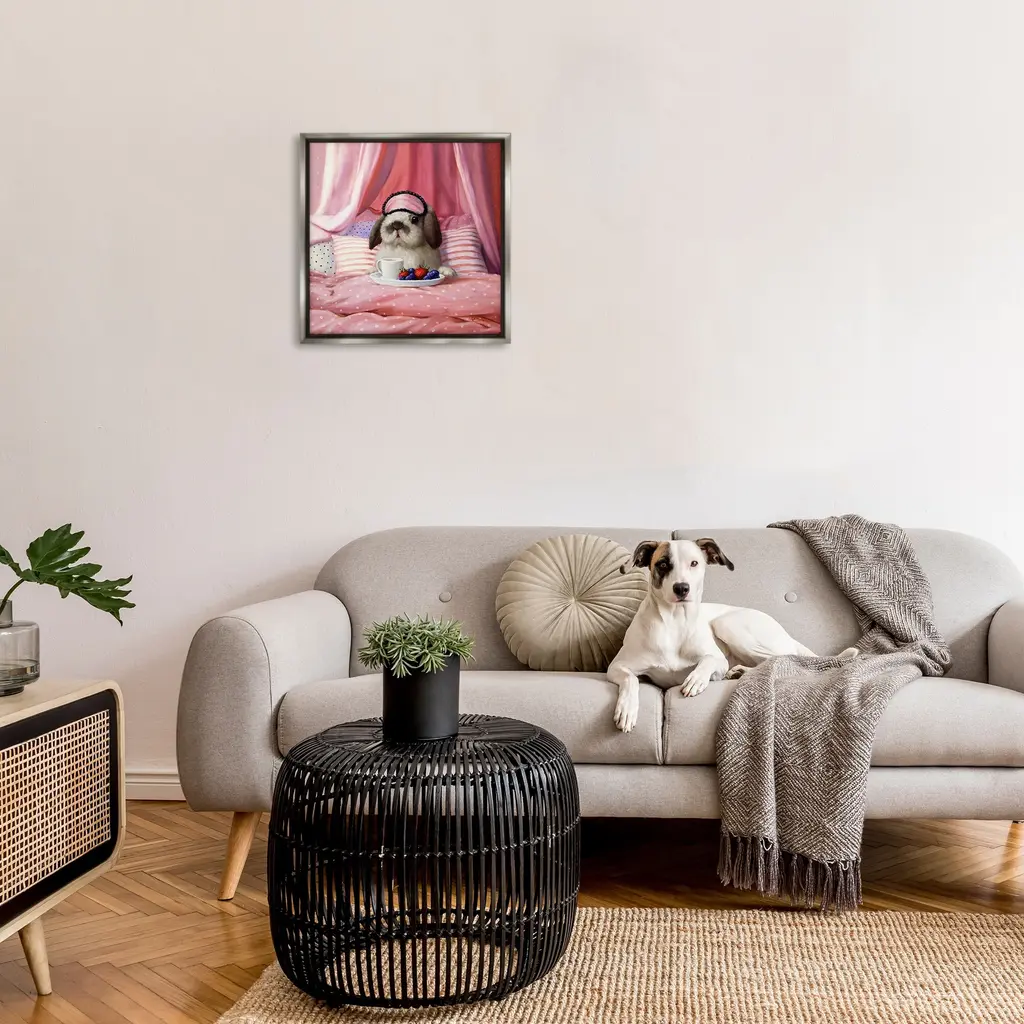 Elevate your home or office to the next level with Stupell Framed Floating Canvas Wall Art. Our premium hand-stretched canvas is mounted securely into a sturdy lightweight frame. The museum-style gap between the wrapped canvas and the box frame gives the illusion of floating artwork. Stupell Wall Art is made in the USA.Features: Dimensions: 18 x 1.7 x 18 Frame, 17 x 1.5 x 17 Canvas ArtFloating Frame Canvas Products are available in sizes 18"x18" and 25"x25". All Floating Frame Canvas Products have a 1.7" Depth.Wall Art is Ready to Hang with Hardware Free Hanging. No Installation required. For Easy Set Up Lean or Layer Artwork on Shelf or Against Wall. Artwork is Permently Fixed into the Frame.Our elevated 1.7" Thick Floating Frame is the perfect complement to our canvas style Wall Art. We use only the highest quality inks in house with industry leading printing solutions. Canvas is hand stretched over a durable wood foundation and then mounted securly into a Modern Box Frame. Made in the USA.Artwork Relates To: Bed, Animal, Mammal, Pet, Blanket, Cup, Coffee, Bunny, Rabbit, Cozy, Relax, PillowDesign by Lucia Heffernan