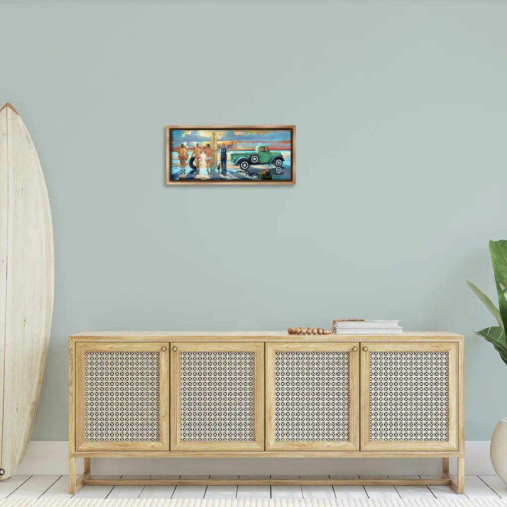 Elevate your home or office to the next level with Stupell Framed Floating Canvas Wall Art. Our premium hand-stretched canvas is mounted securely into a sturdy lightweight frame. The museum-style gap between the wrapped canvas and the box frame gives the illusion of floating artwork. Stupell Wall Art is made in the USA.Features: Dimensions: 25 x 1.7 x 11 Frame, 24 x 1.5 x 10 Canvas ArtFloating Frame Canvas Products are available in sizes 25"x11" and 31"x14". All Floating Frame Canvas Products have a 1.7" Depth.Wall Art is Ready to Hang with Hardware Free Hanging. No Installation required. For Easy Set Up Lean or Layer Artwork on Shelf or Against Wall. Artwork is Permently Fixed into the Frame.Our elevated 1.7" Thick Floating Frame is the perfect complement to our canvas style Wall Art. We use only the highest quality inks in house with industry leading printing solutions. Canvas is hand stretched over a durable wood foundation and then mounted securly into a Modern Box Frame. Made in the USA.Artwork Relates To: Painting, Pickup Truck, Transportation, Truck, Vehicle, Person, Women, Beach, Surfboard, Coast, Reflection, Sky, ButlerDesign by Ronald West