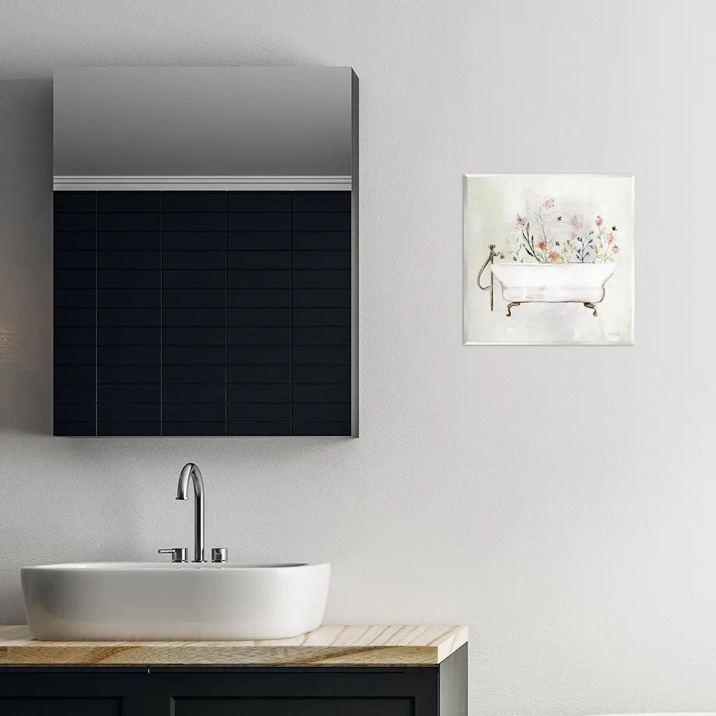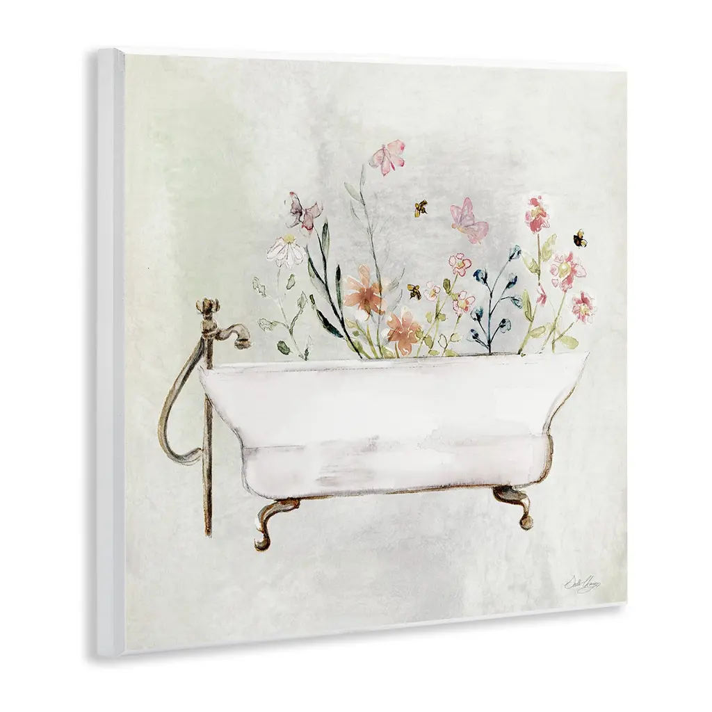 Our wall plaques start as high-quality lithograph prints mounted on durable 0.5-inch thick MDF wood. Each piece is hand finished and comes with a fresh layer of white foil on the sides to give it a crisp, clean look. Plaques arrive ready to hang without installation and come with removable plastic corners to keep them from damage in transit. Stupell Wall Art is made in the USA.Features: Dimensions: 12 x 0.5 x 12 InchesWall Art is Ready to Hang with Hardware Free Hanging. No installation required. For Easy Set Up Lean or Layer Artwork on Shelf or Against Wall.All of our wall plaques start off as high quality lithograph prints that are then mounted on durable 0.5 inch thick MDF wood. Each piece is hand finished and comes with a fresh layer of foil on the sides to give it a crisp clean look. Made In USA.Artwork Relates To: Bathing, Bathtub, Tub, Bathroom, Floral, Flower, Botanical, ButterflyDesign by Stella Chang