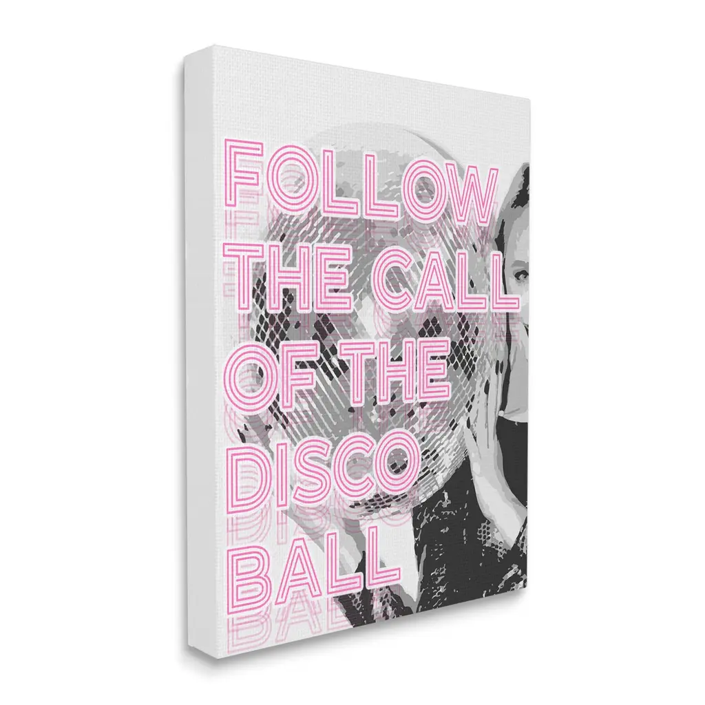 We create our stretched canvas to the highest standards. Using only the highest quality inks and canvas on Mimaki printers, we hand-cut and stretch each piece over a 1.5-inch thick wooden frame for hanging. As a result, the art comes ready to hang on the sturdy ledge with no installation required. Stupell Wall Art is made in the USA.Features: Dimensions: 16 x 1.5 x 20 InchesStretched Canvas Sizes Include Standard: 16 x 1.5 x 20 Large: 20 x 1.5 x 30 X-Large: 30 x 1.5 x 40 Oversized: 36 x 1.5 x 48Wall Art is Ready to Hang - No Installation or Hardware Needed. For Easy Set Up Lean or Layer Artwork on Shelf or Against Wall.Our stretched canvas is created with the highest standards. We use only the highest quality inks and canvas on our in house Mimaki printers, and then hand cut and stretch each piece over a 1.5 inch thick wooden frame for hanging. Made In USA.Artwork Relates To: Disco Ball, Retro, Bold, Person, Woman, Follow The Call Of The Disco BallDesign by Lil' Rue